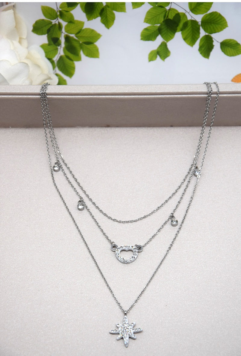Le collier Angela est un bijou en acier inoxydable de qualité qui se démarque par son élégance et sa couleur argent. Avec ses 3 rangées, il ajoutera une touche d'originalité à votre tenue. Un accessoire incontournable pour toute amatrice de joaillerie.
