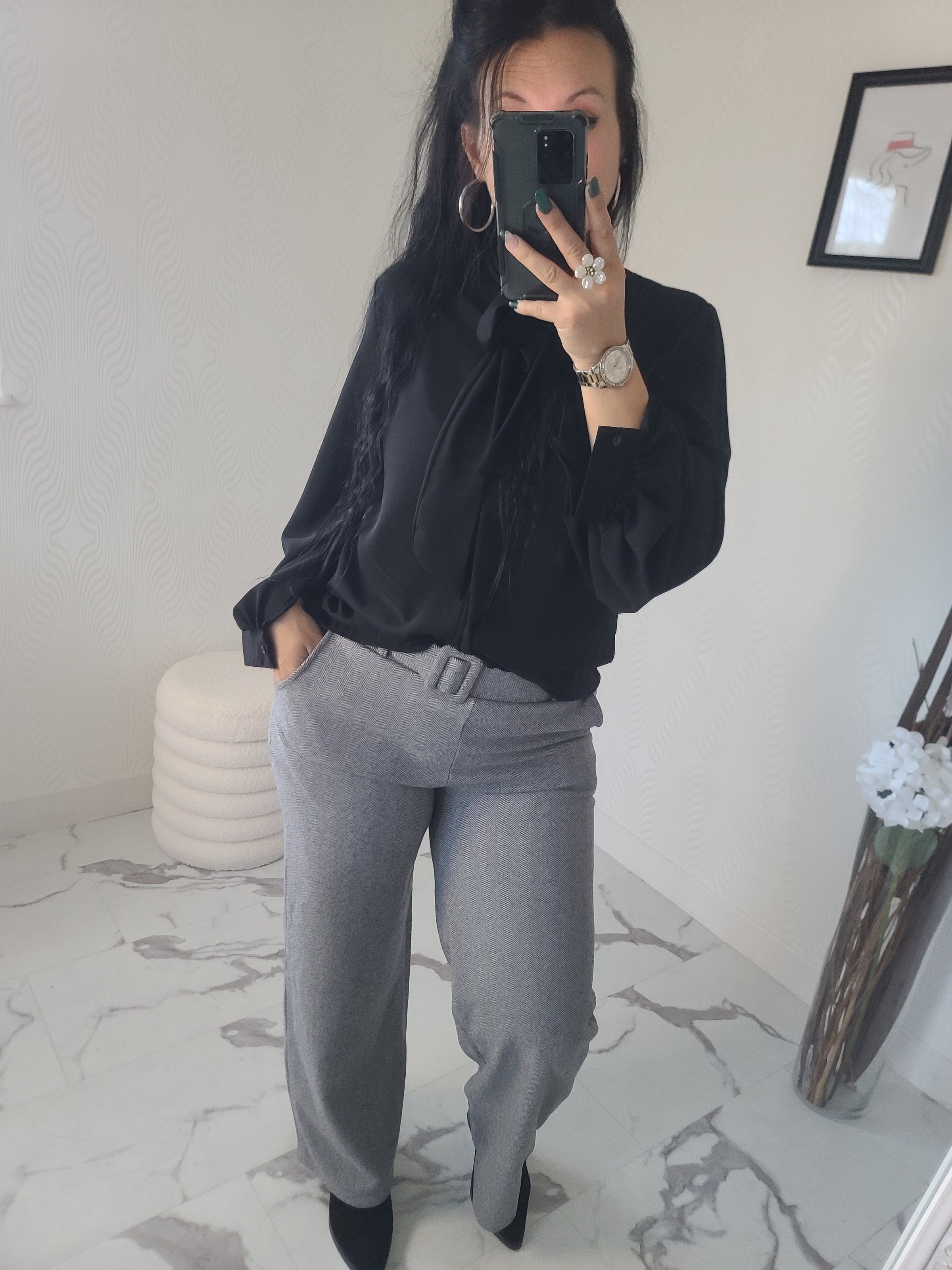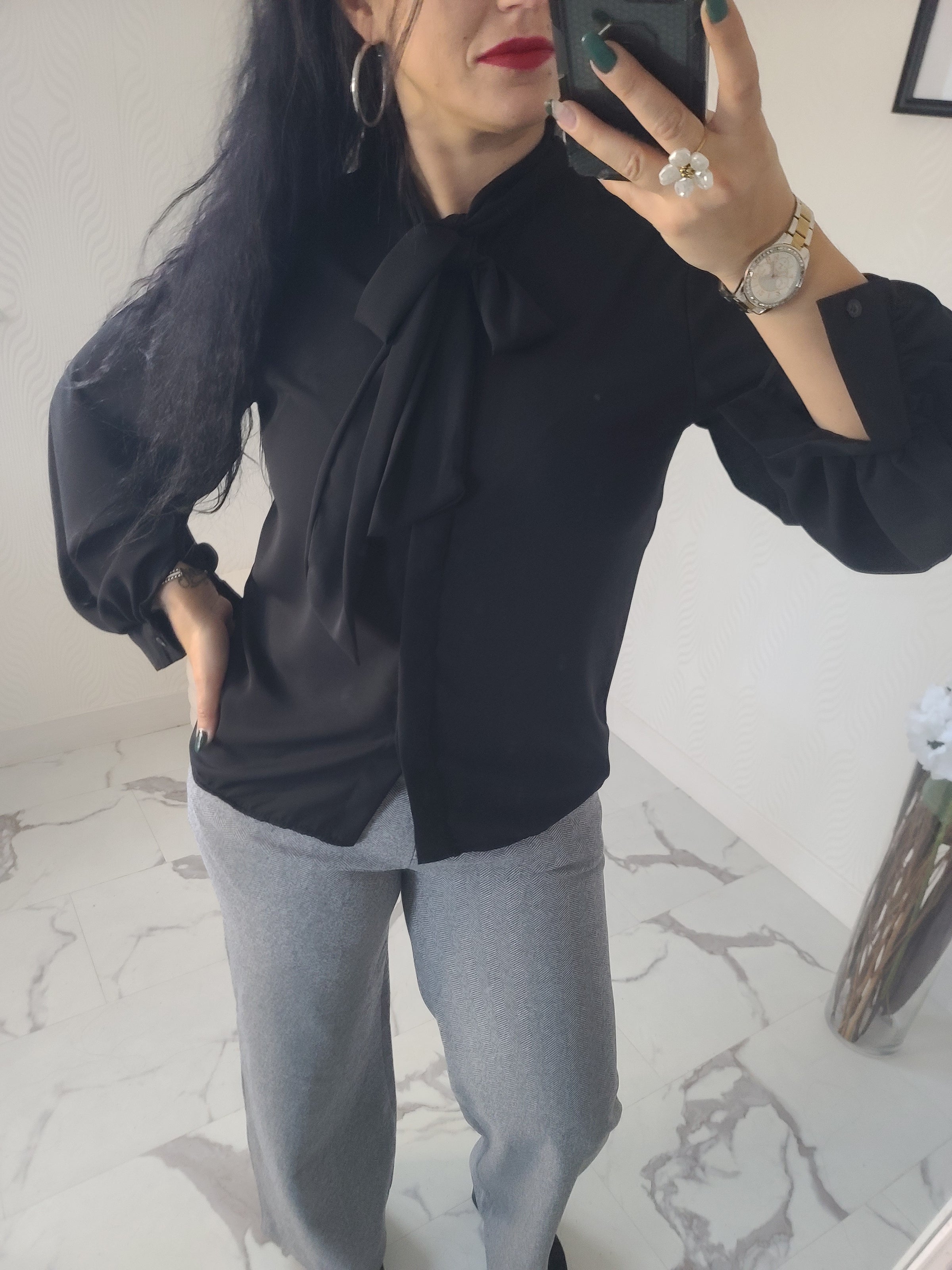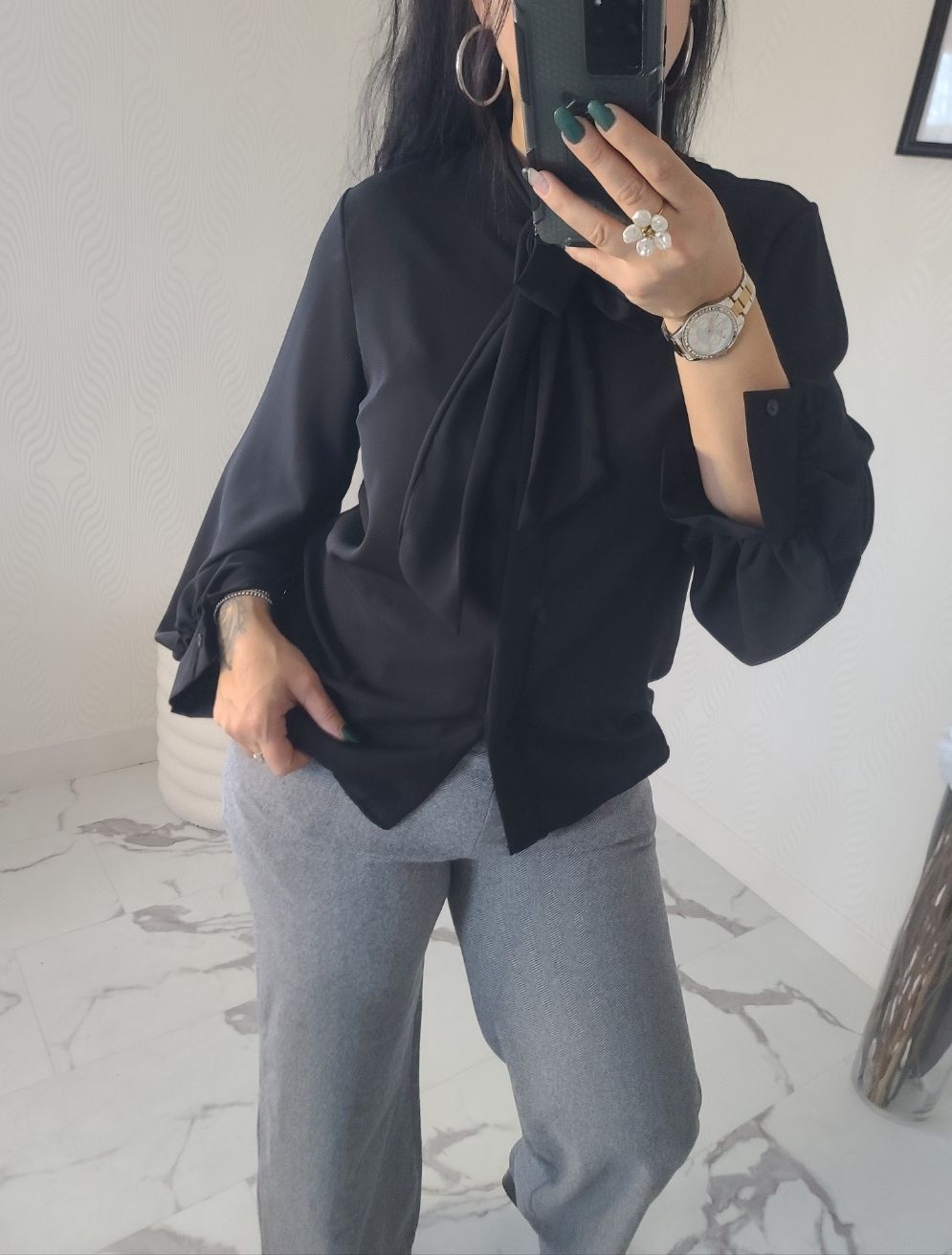 Chemisier AMELIA chic, manches tendance, avec nœud-cravate. Col lavallière. Chemisier qui s’ouvre devant avec 6 boutons qui sont camouflés par une double épaisseur pour un coté plus chic et Tendance. La taille unique convient du 36 au 42.