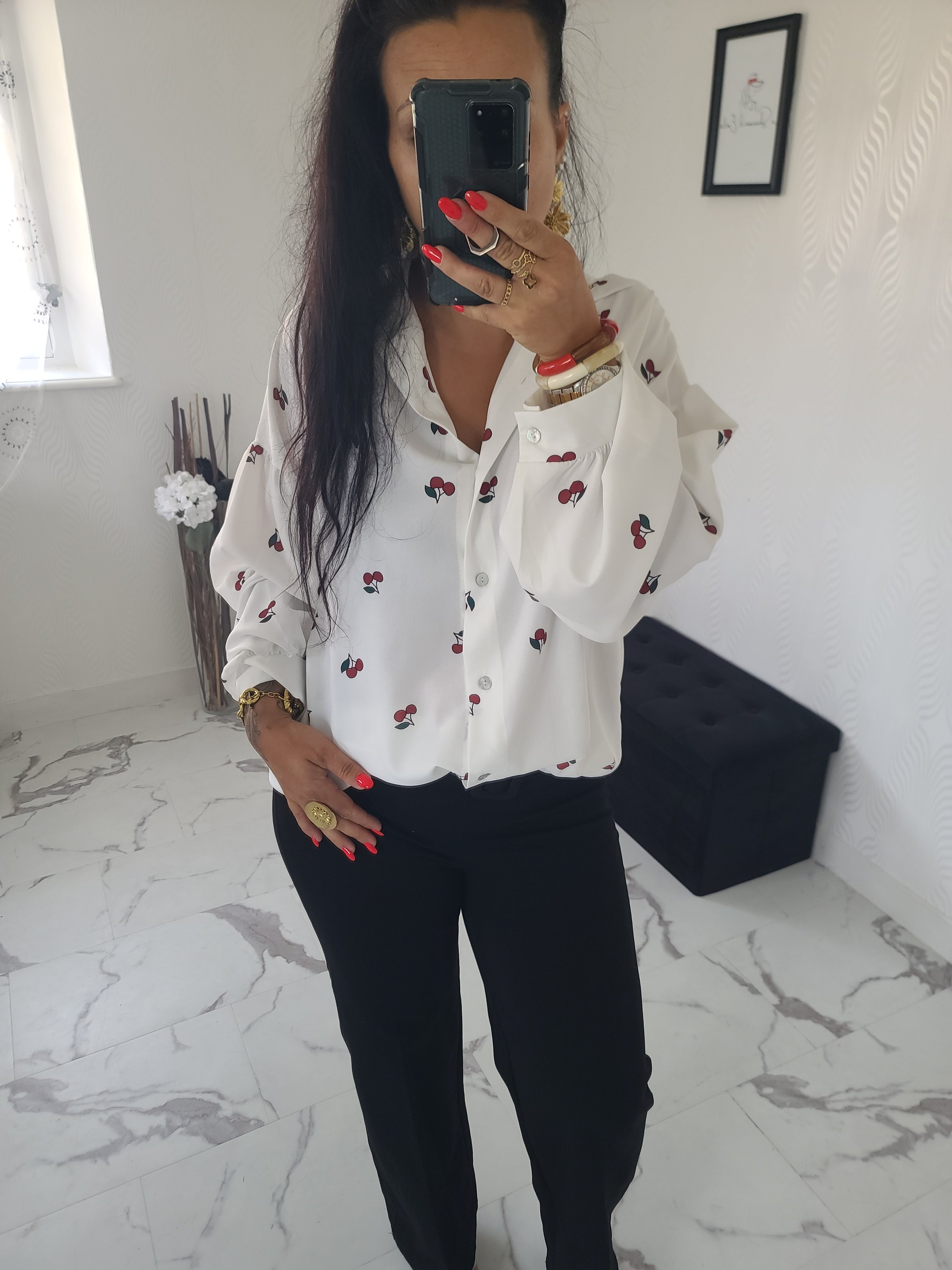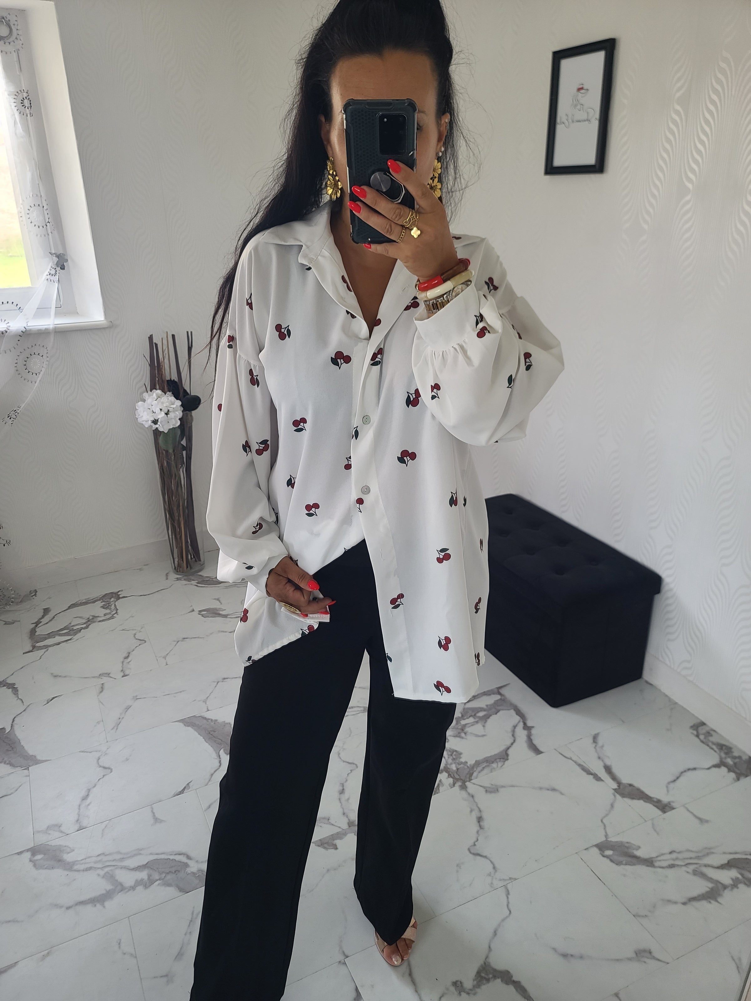 Magnifique chemise Cerise imprimée dans une matière très douce et confortable. Chemise oversize. Elle peut se porter nouée ou non de manière classique.