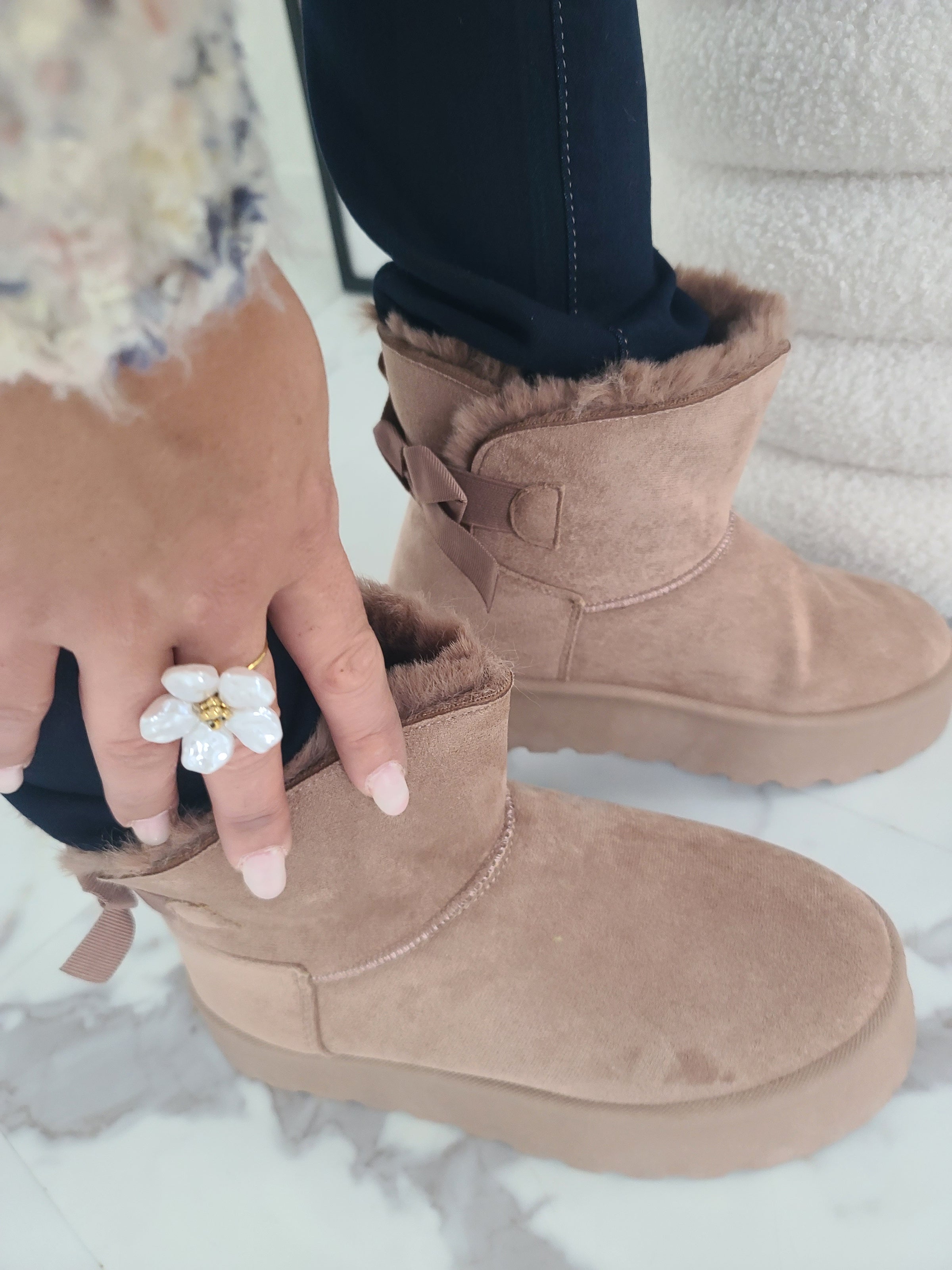 Bottines fourrées taupe, avec un détail nœud à l'arrière. Vous pouvez les porter aussi bien avec un pantalon, une jupe et une robe, pour un look tendance et confortable. Elles sont entièrement fourrées et très chaude