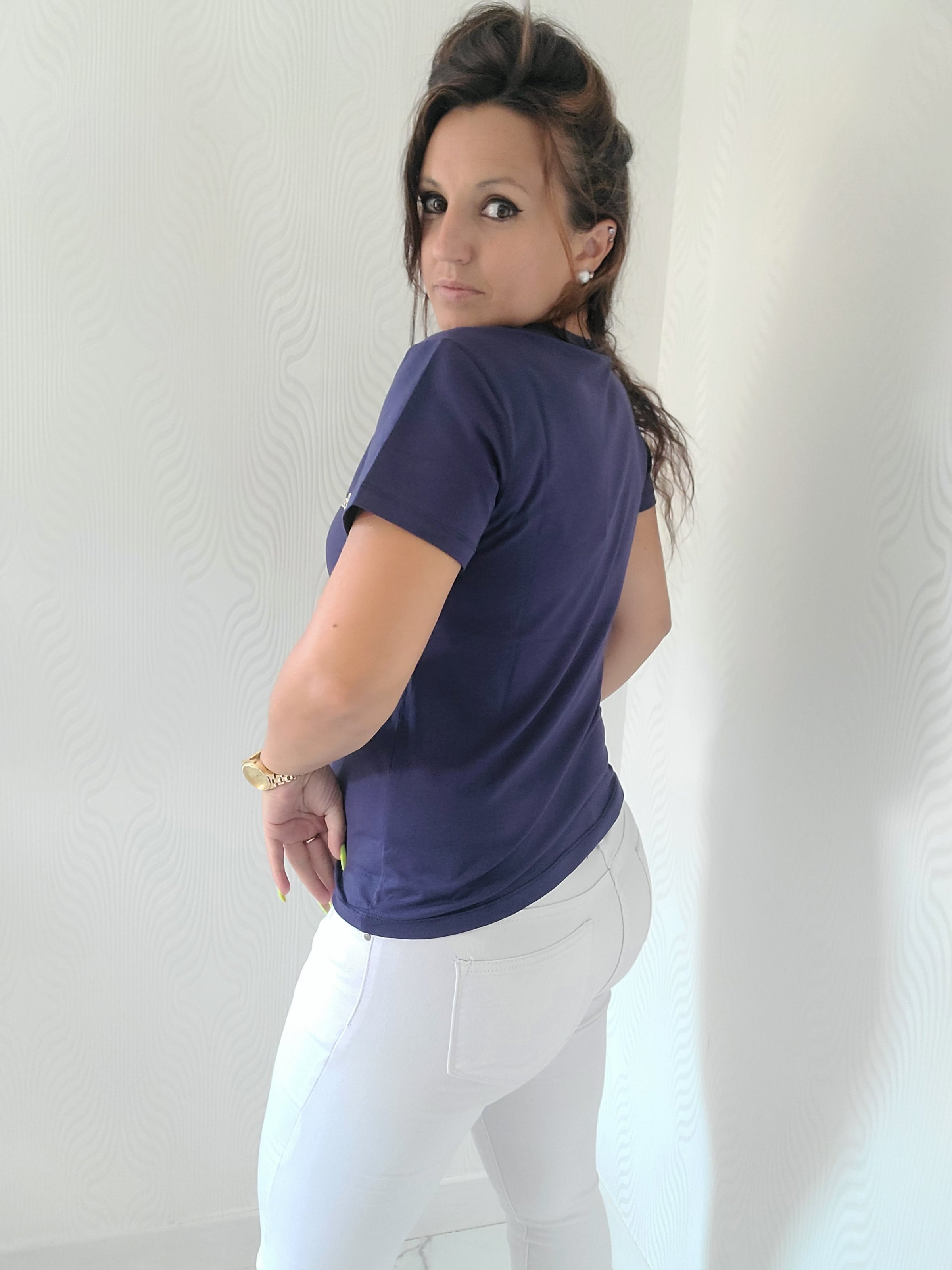 T-shirt uni bleu marine manches courtes agrémenté d’une jolie inscription dorée sur le devant, fabriqué en coton pour plus de confort. Le t-shirt col en V, brodé du message « des étoiles plein les yeux » peut se porter seul ou en duo avec votre fille pour une émotion décuplée. Super coupe et vraiment très agréable à porter.