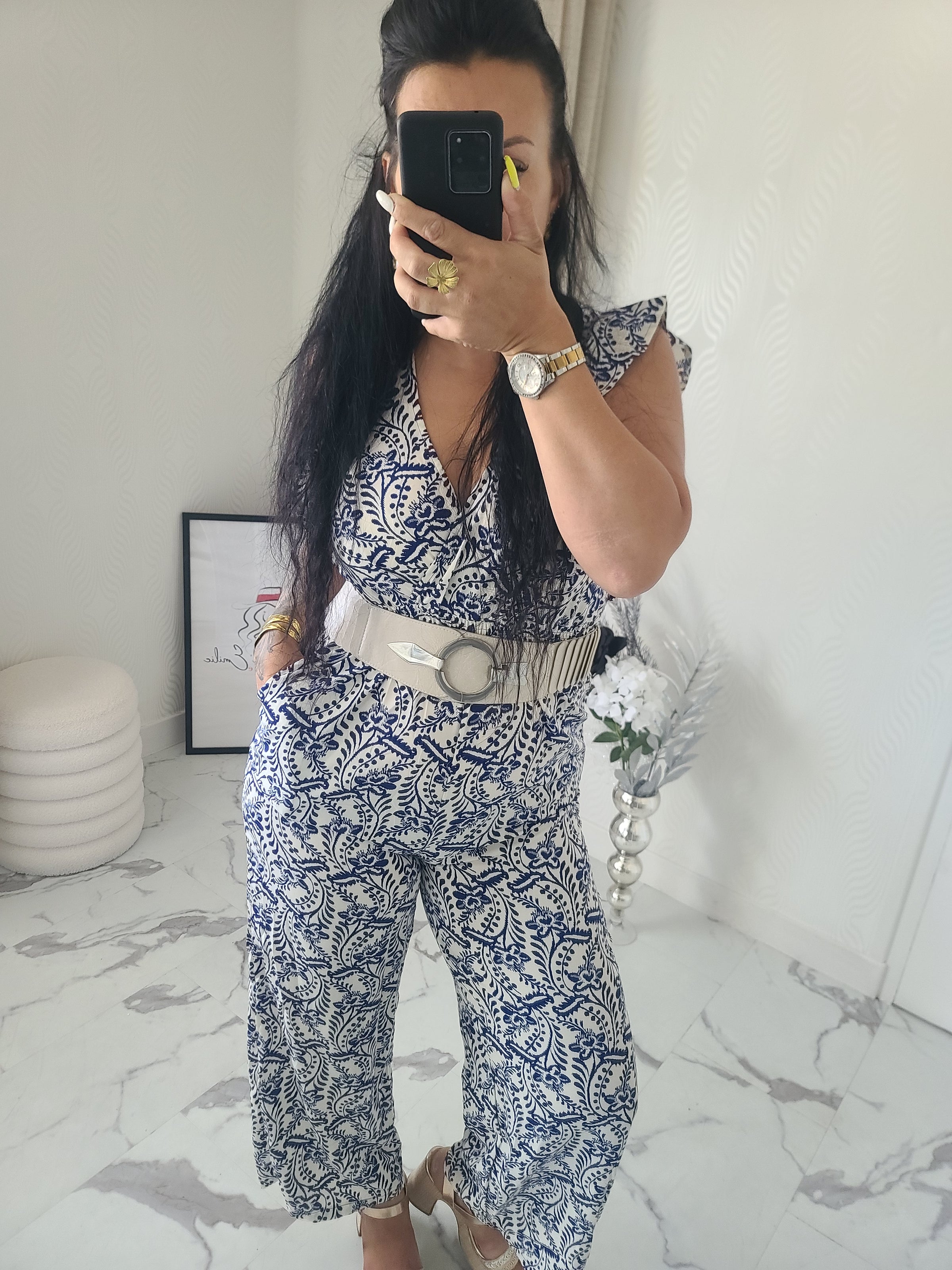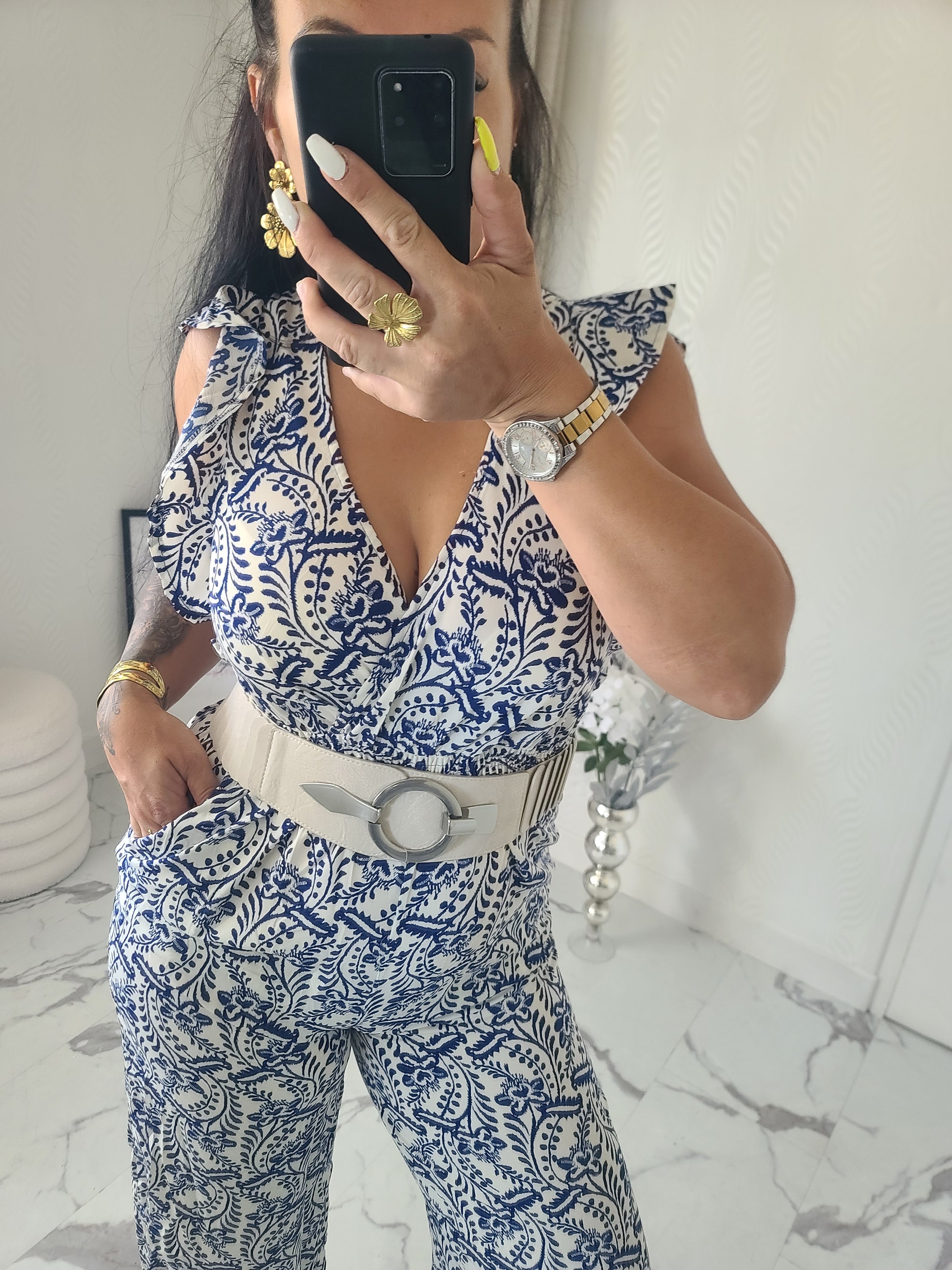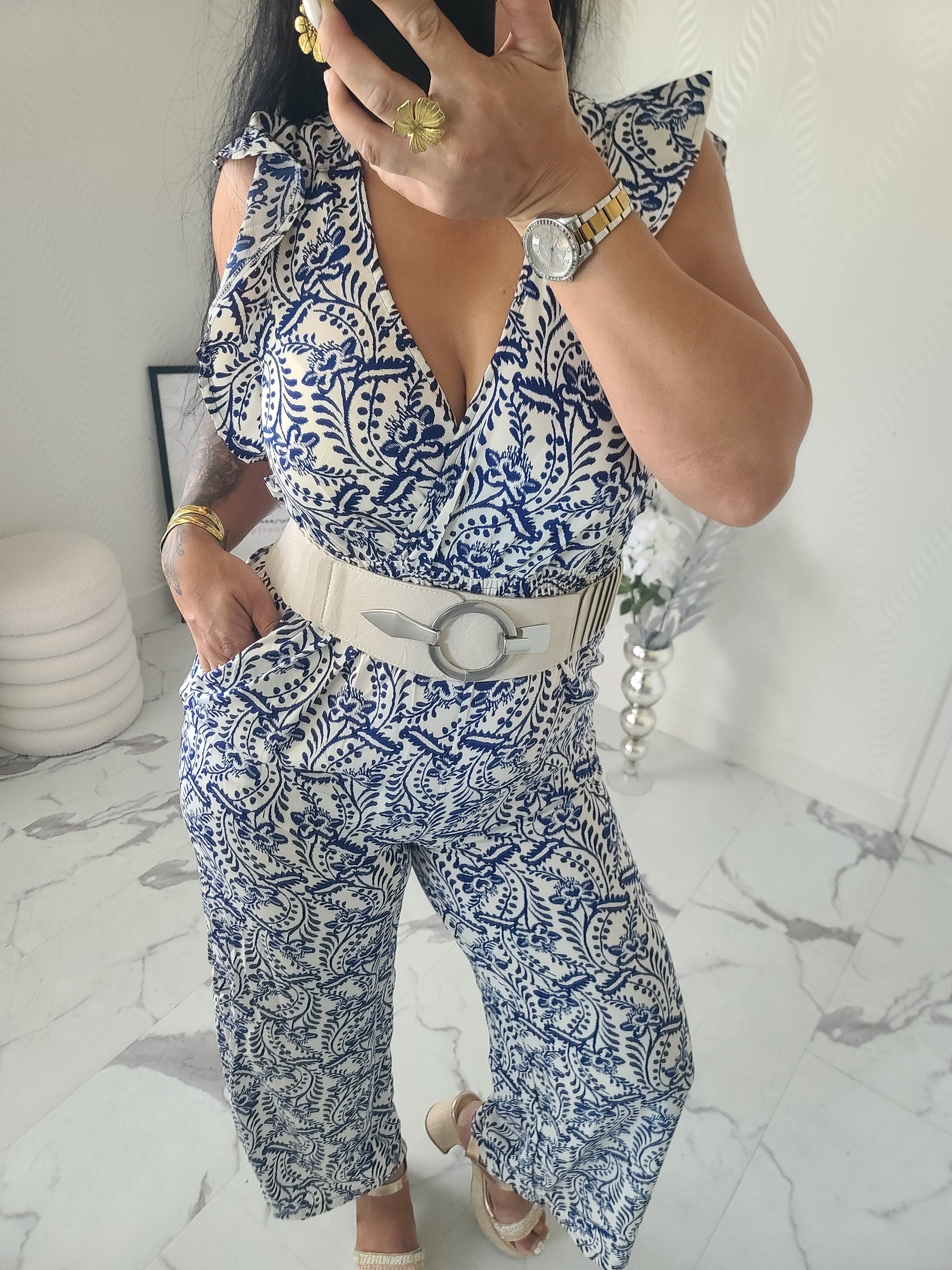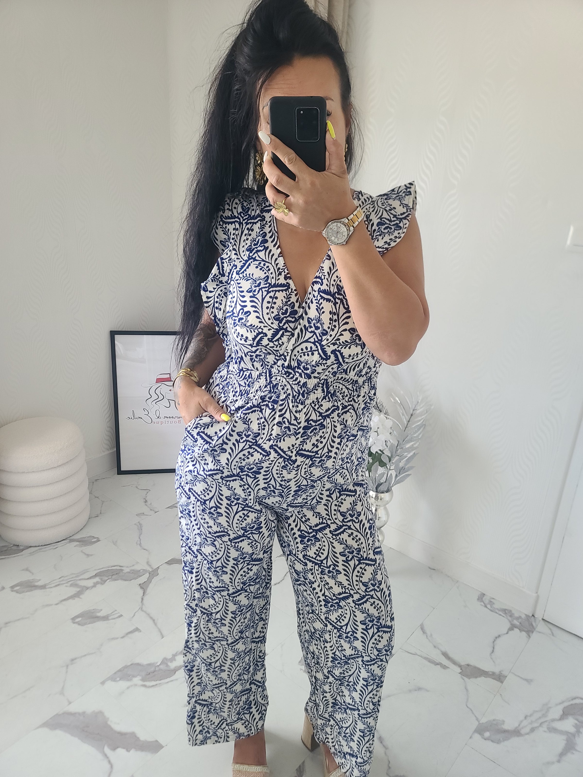 Combinaison motif floral, volants au niveau des manches et lien de serrage au niveau du cou