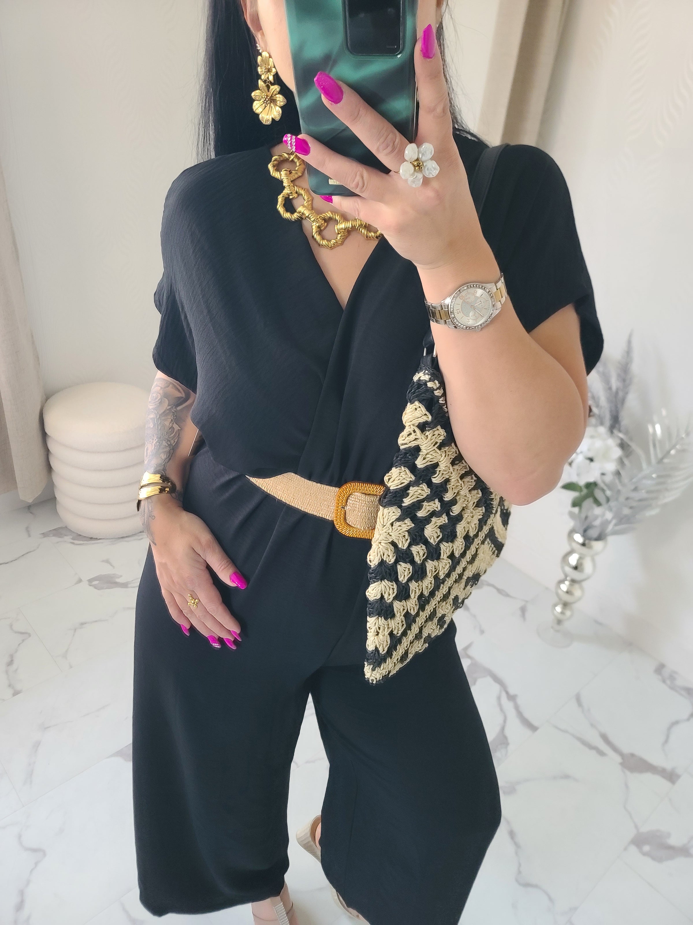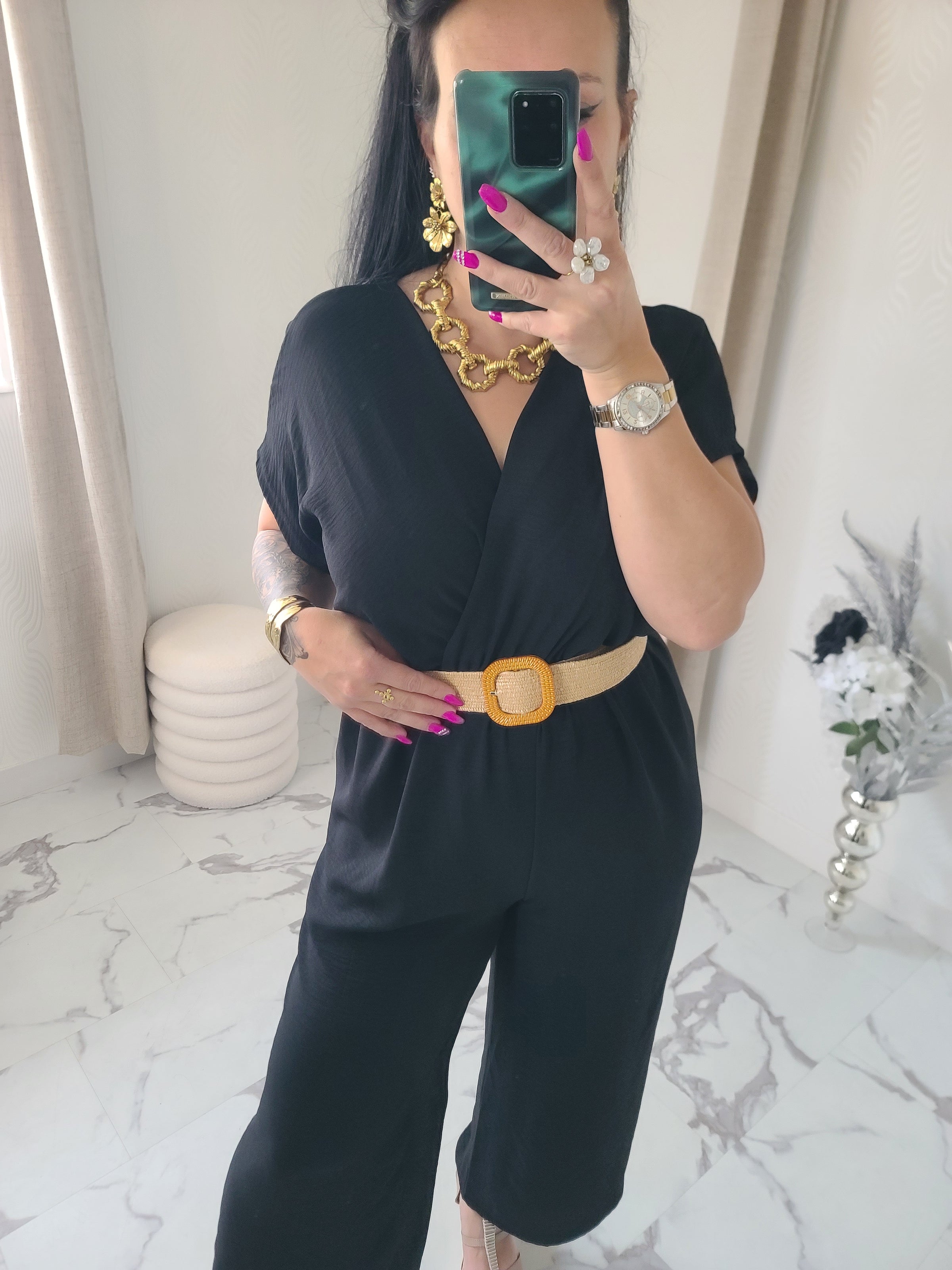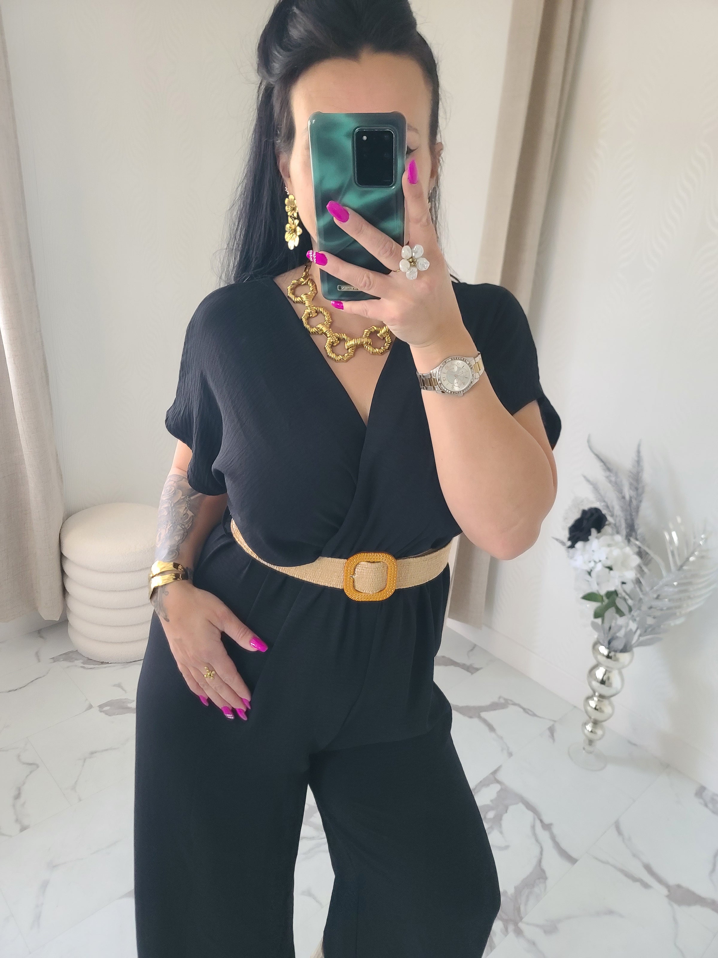 La Combinaison Tess est un indispensable pour toute garde-robe. Avec son col V flatteur et sa ceinture, cette combi-pantalon noire est à la fois élégante et confortable. Parfaite pour toutes les occasions, elle vous rendra irrésistible tout en vous assurant un confort optimal. La taille unique convient du 36 au 48.