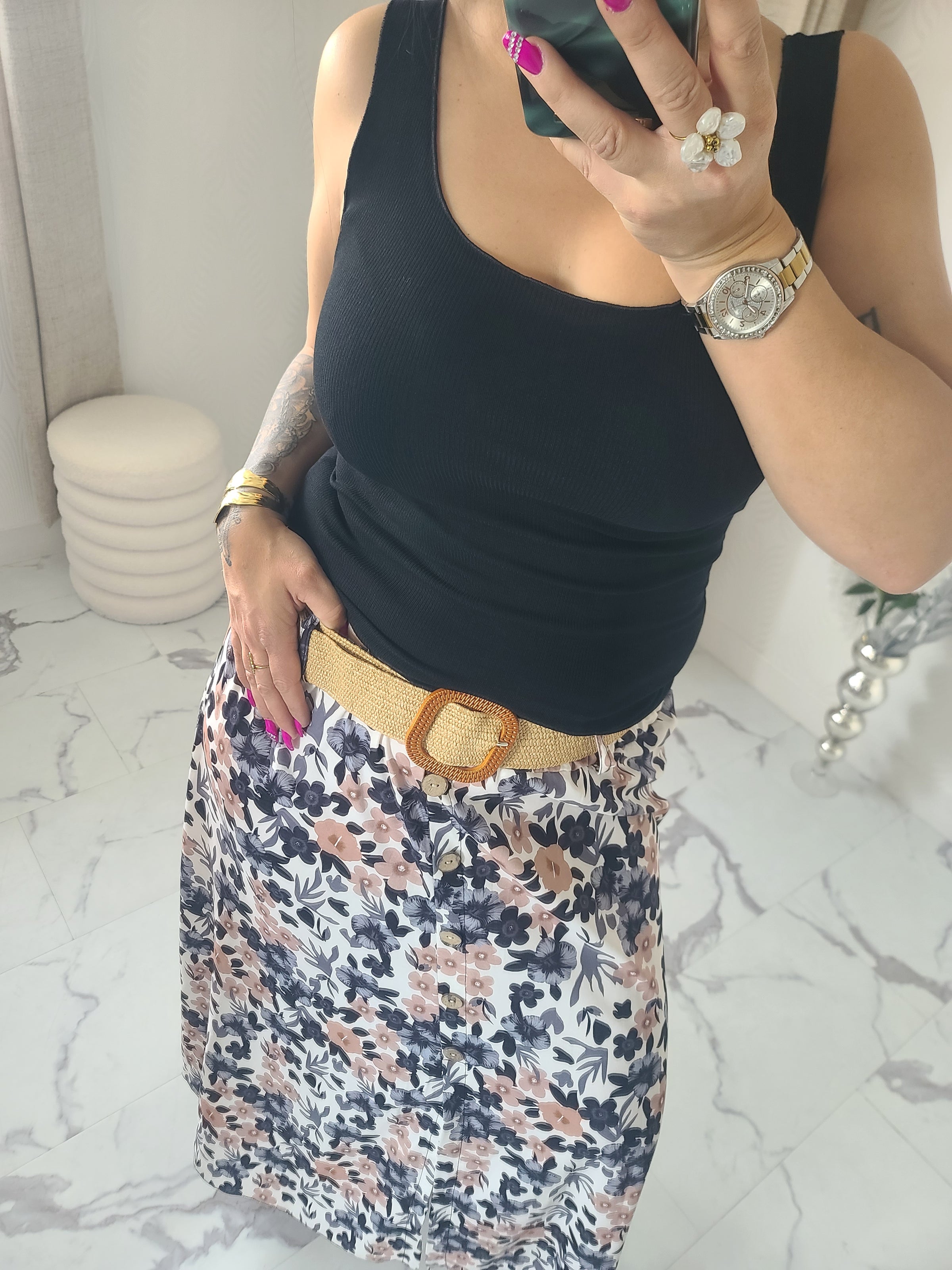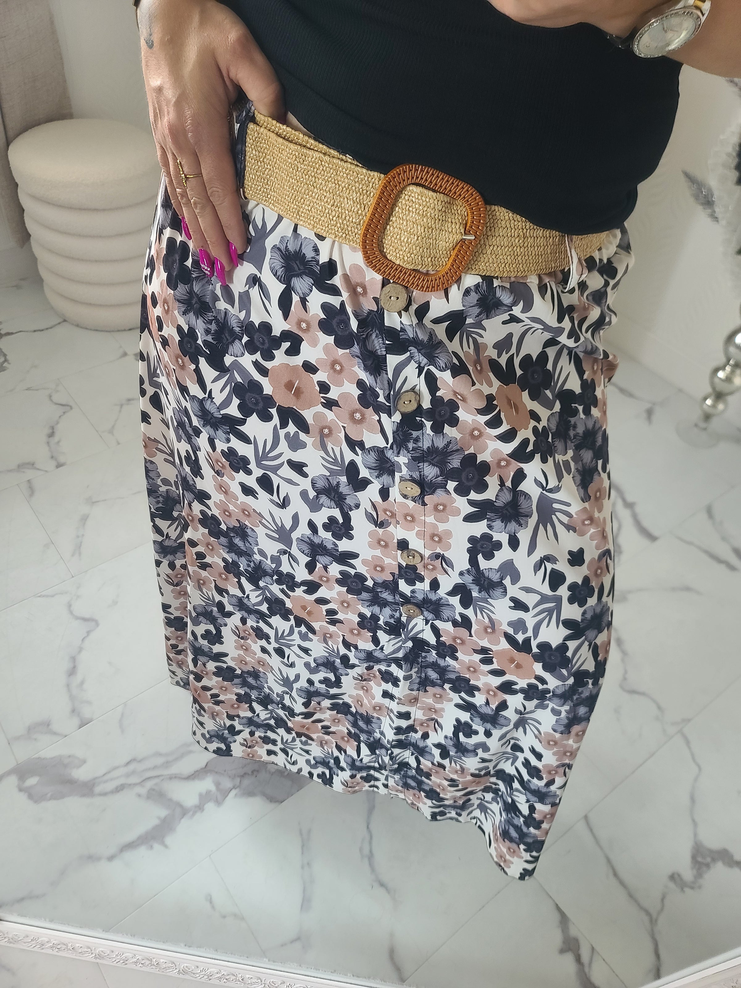 Jupe longue, fluide, imprimée fleuri avec la ceinture fourni, faux boutons et une fente sur le devant.