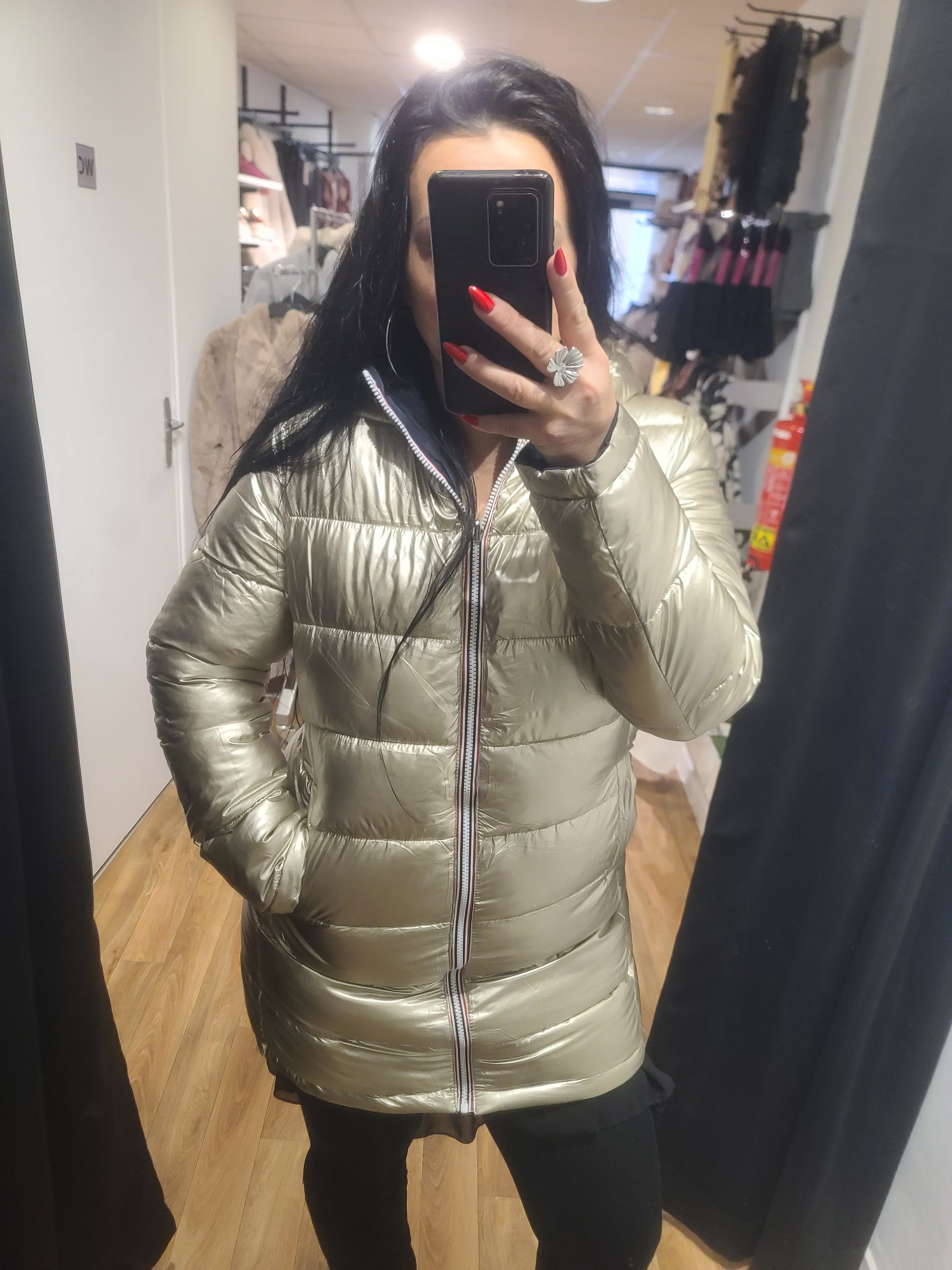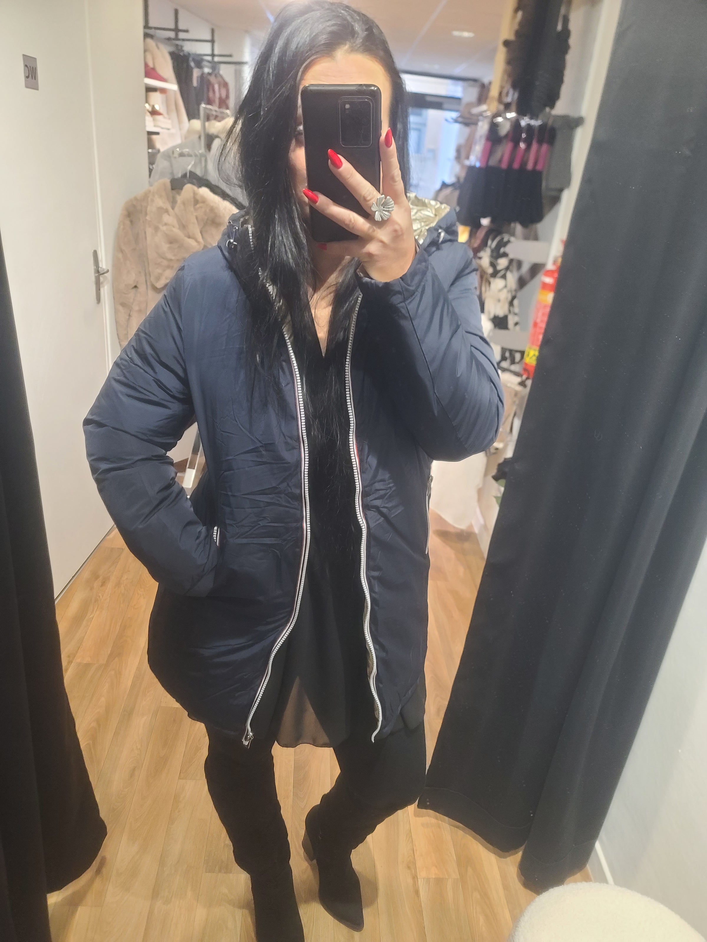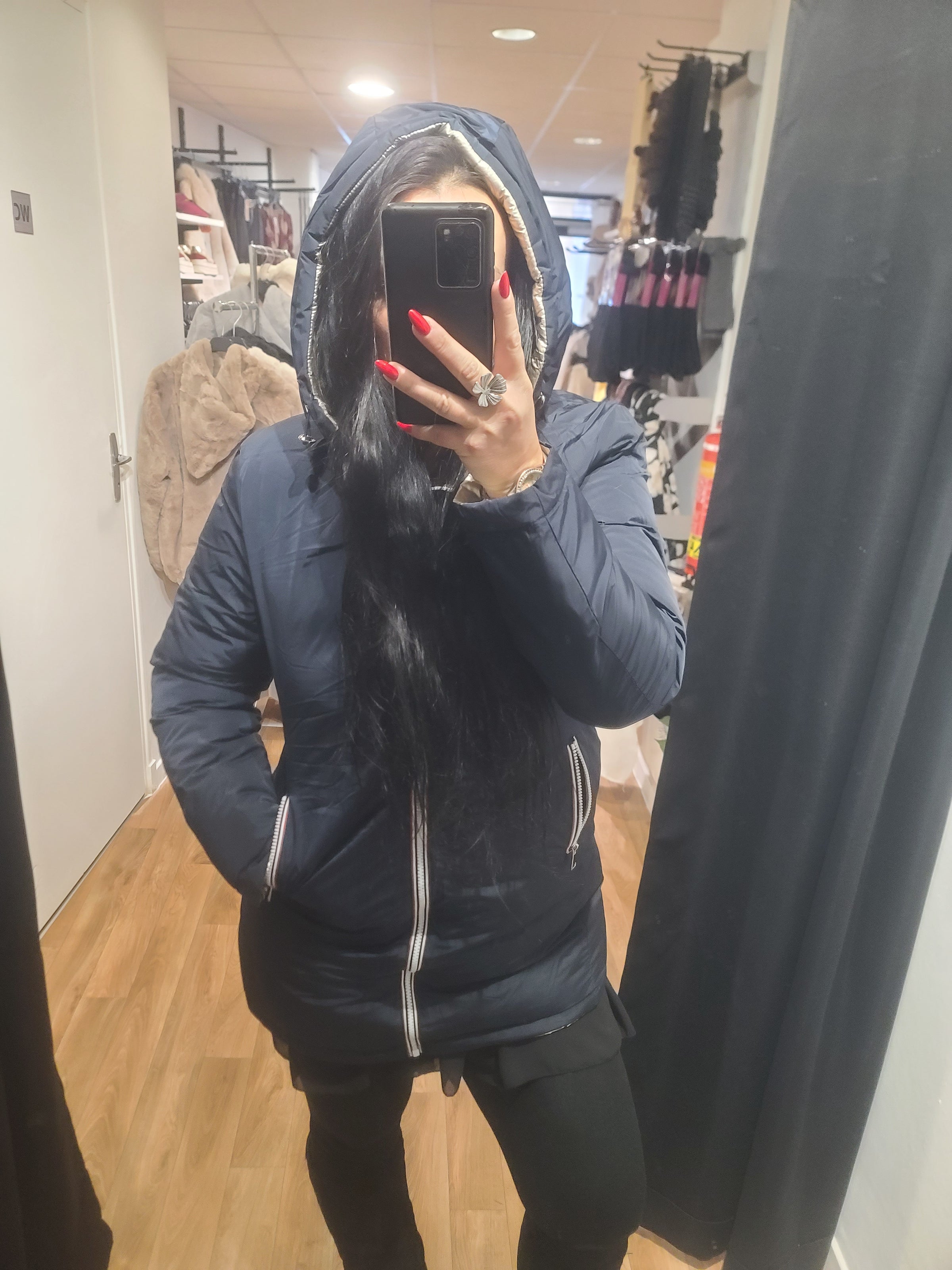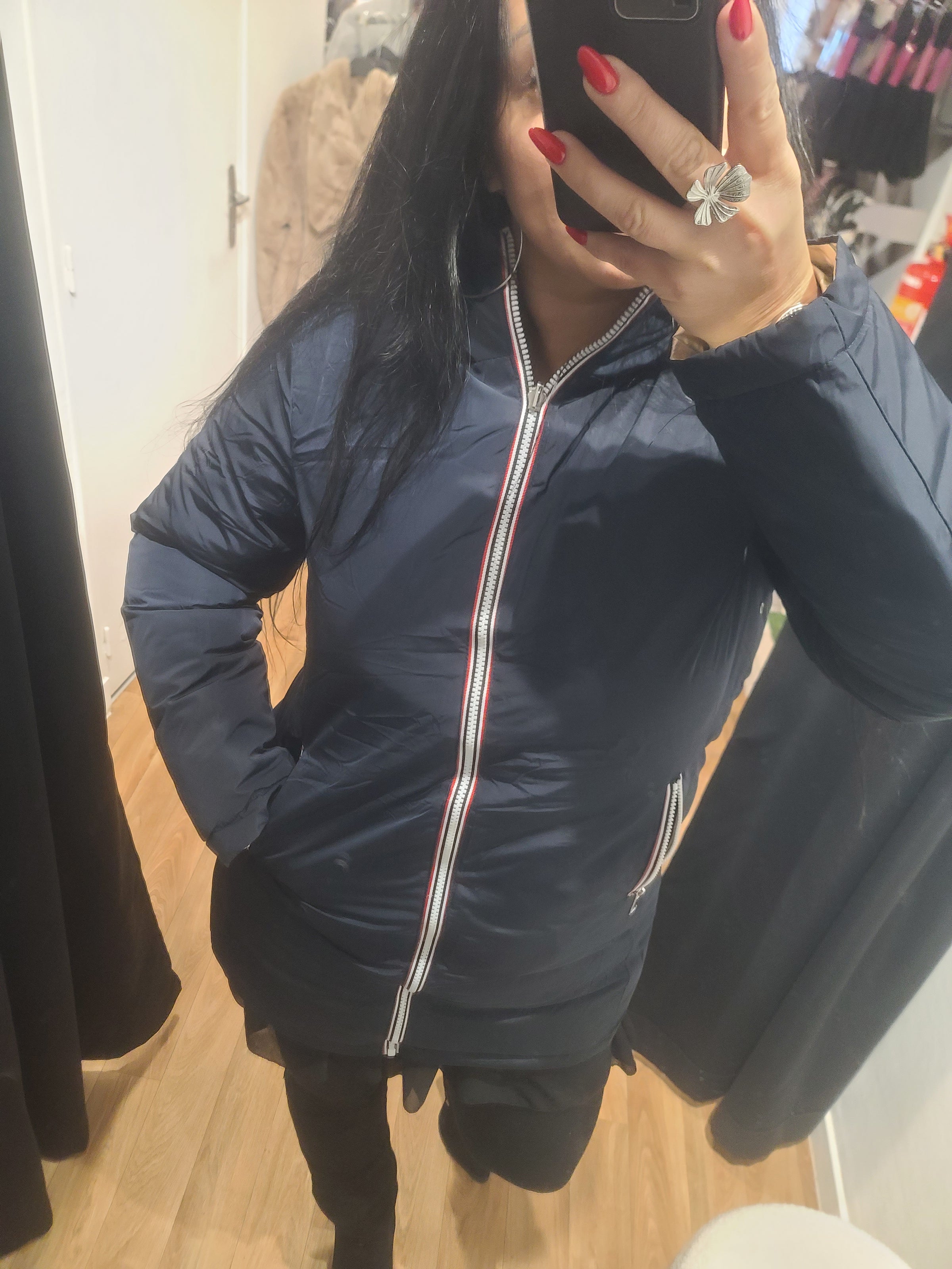 Épaisse et chaude, avec capuche doté d'un cordon de serrage, deux poches à fermetures éclaires côté marine et deux poches classiques côté doré