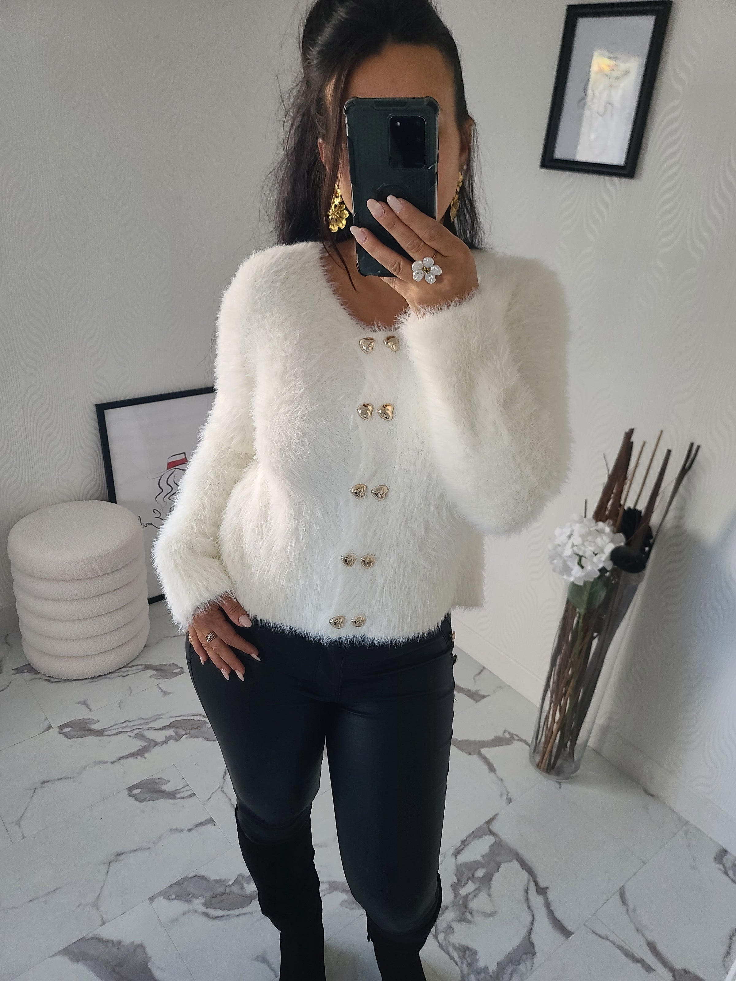 Gilet CELESTIN en maille avec détails boutons dorés en forme de cœurs, tout doux et chaud! La taille unique convient du 36 au 42