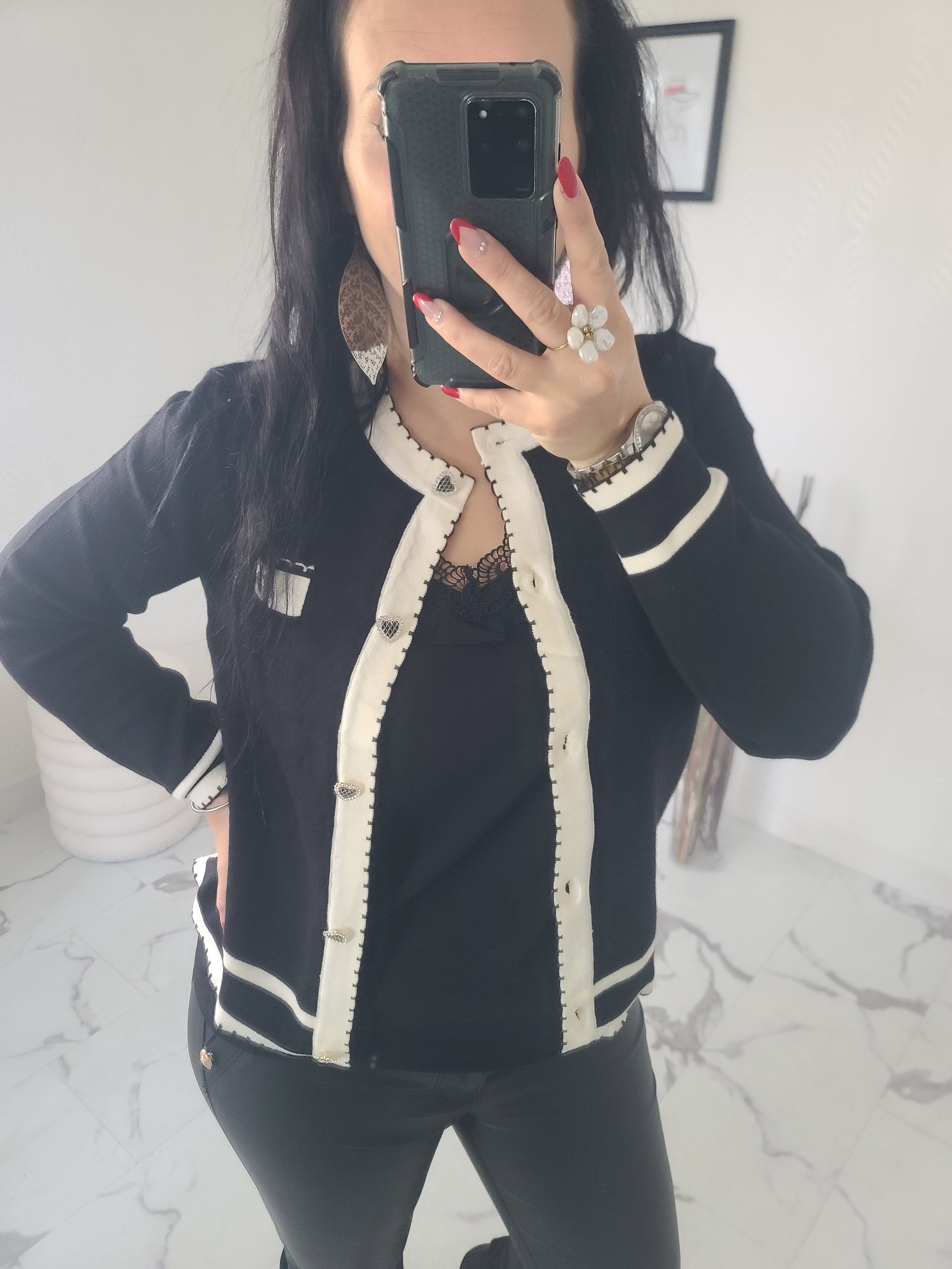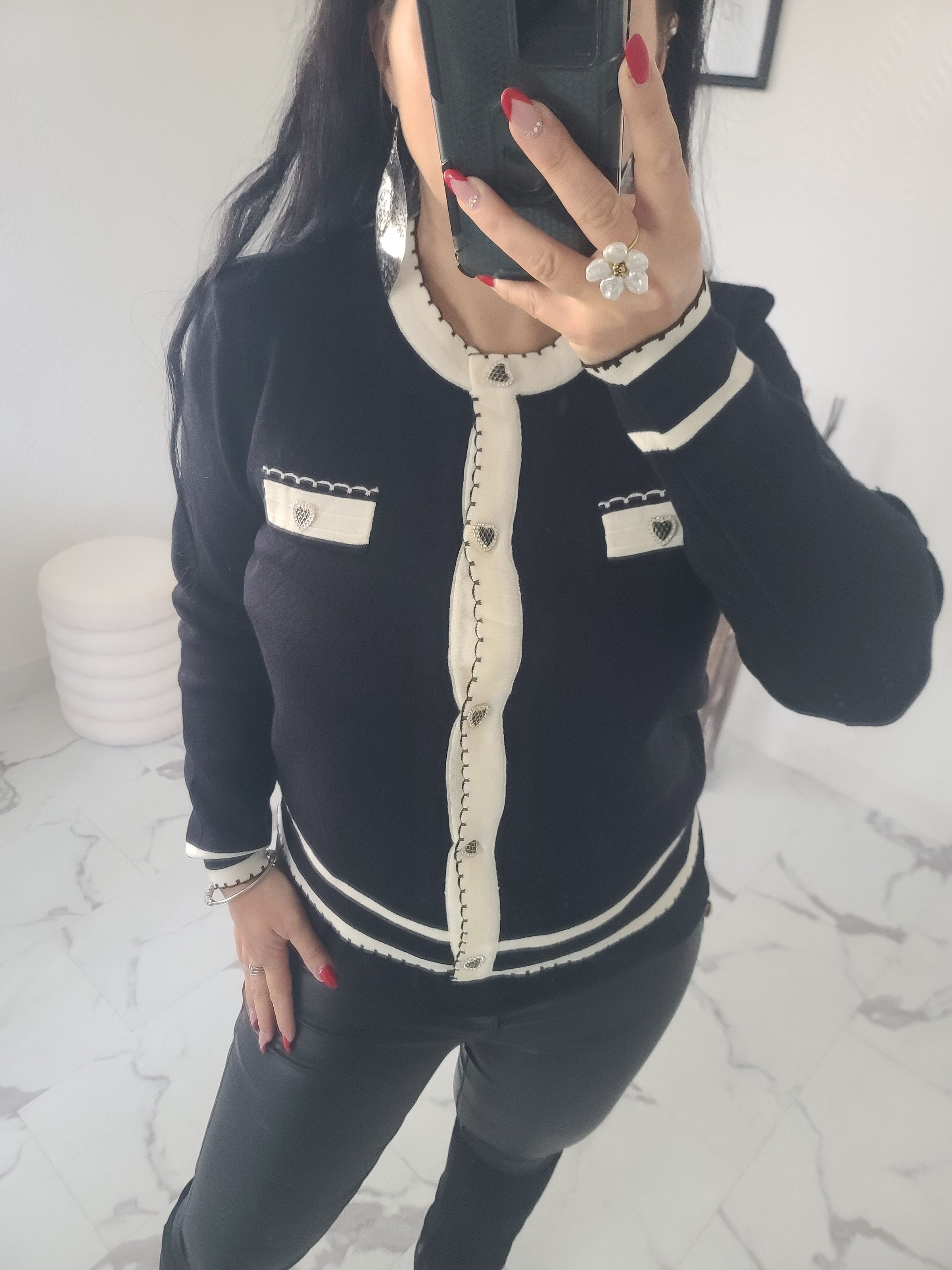 Gilet col rond noir avec de jolis liserés blancs et des boutons en forme de cœurs qui apporte une touche d'élégance.