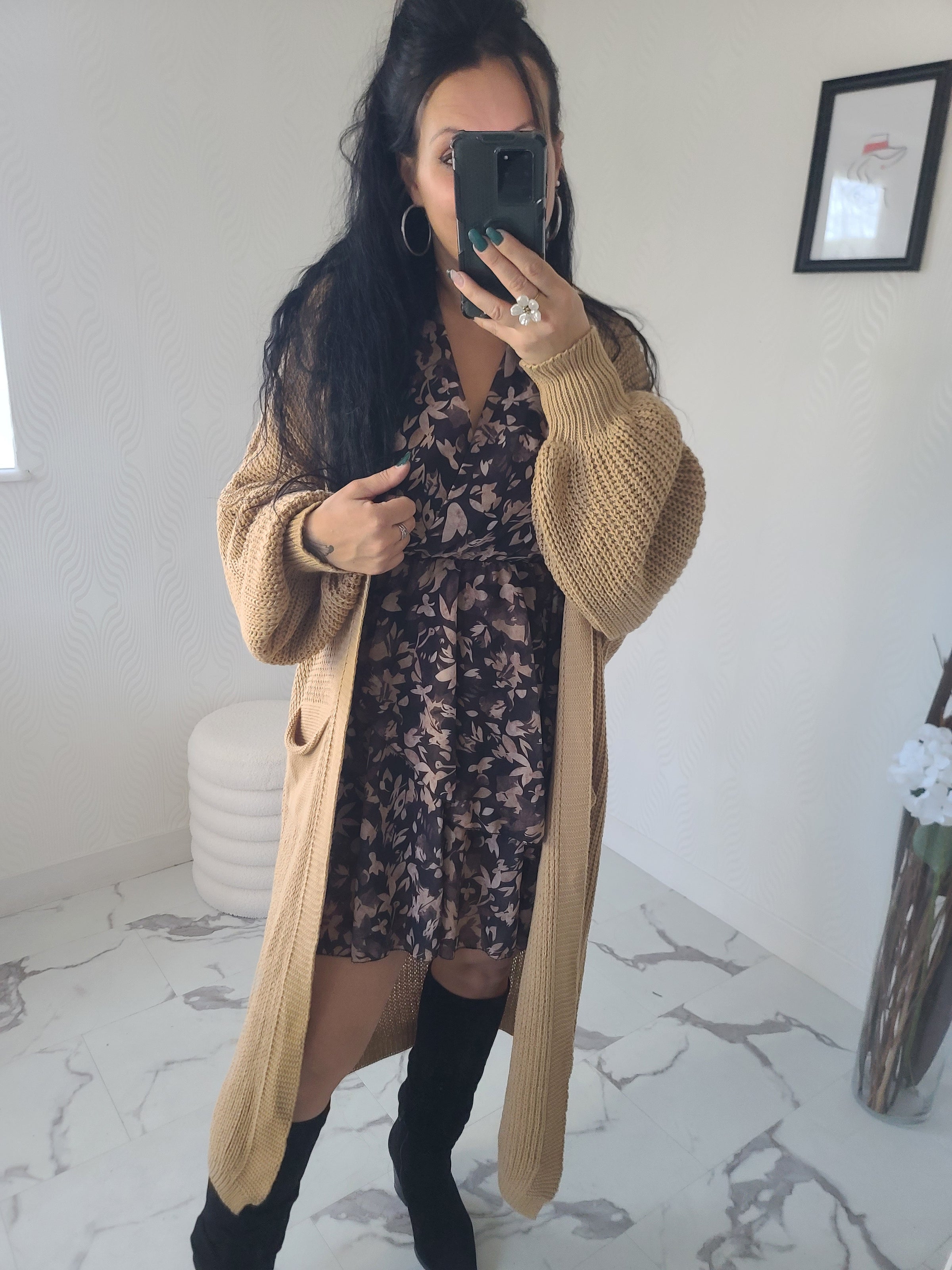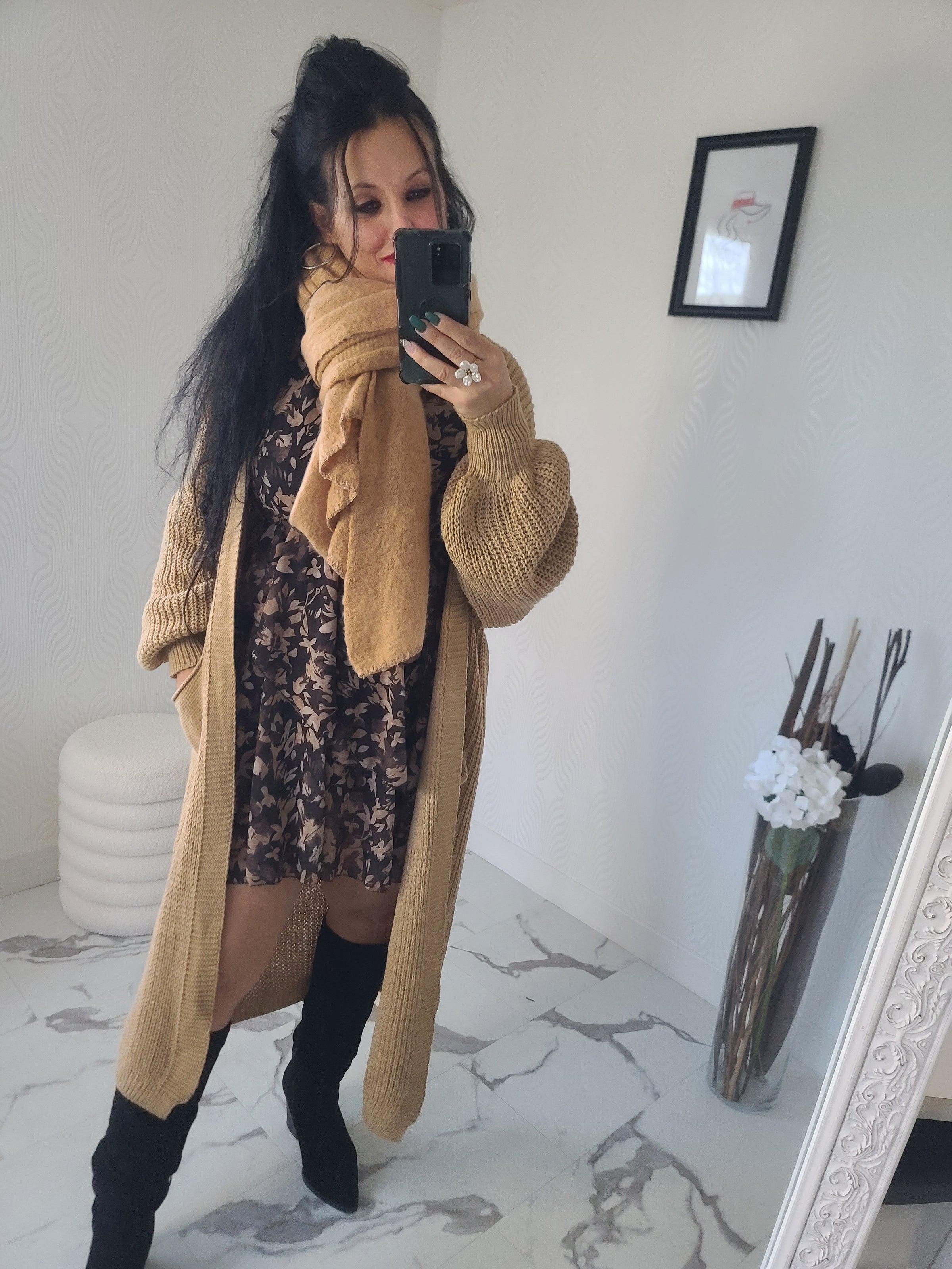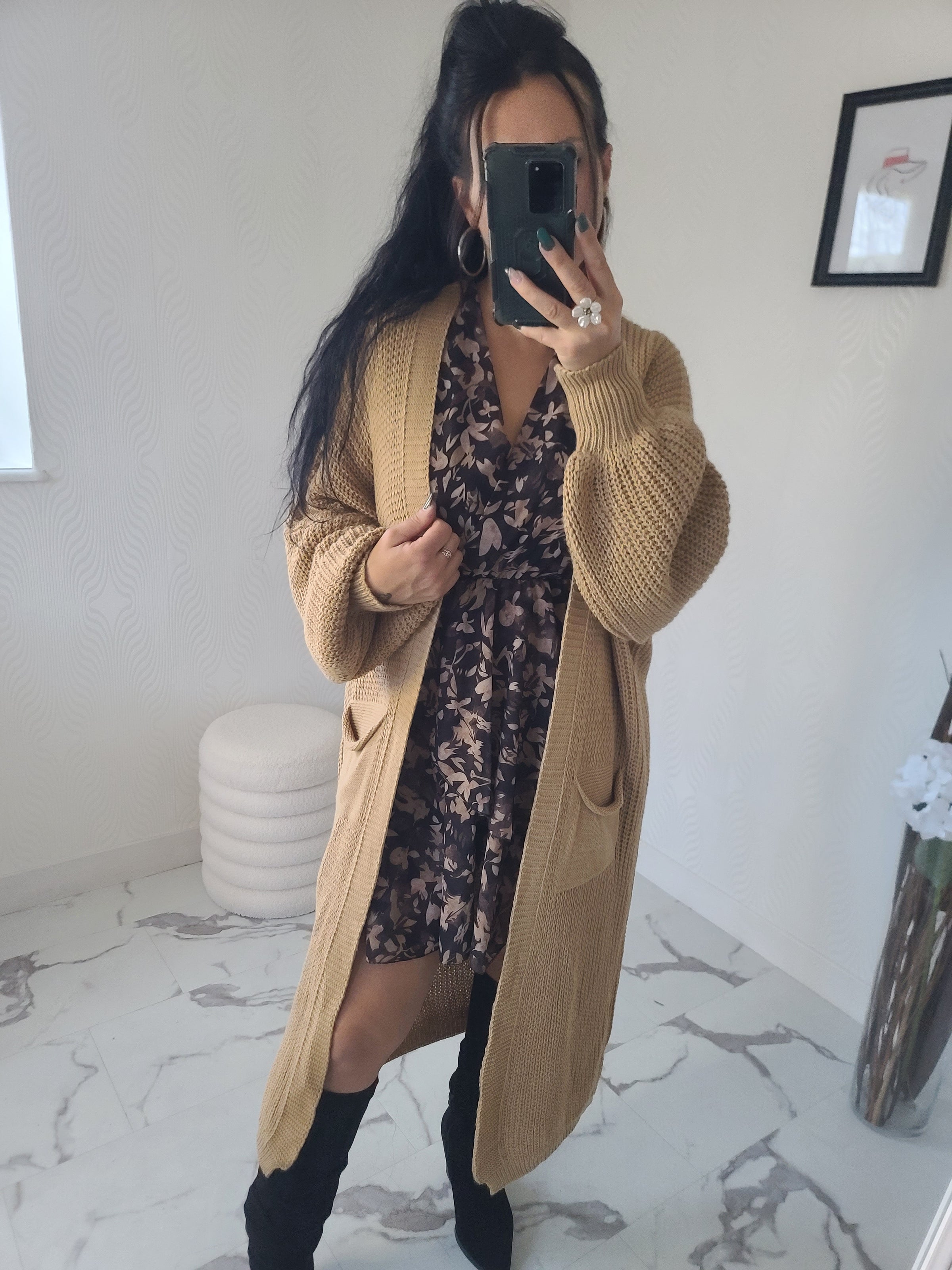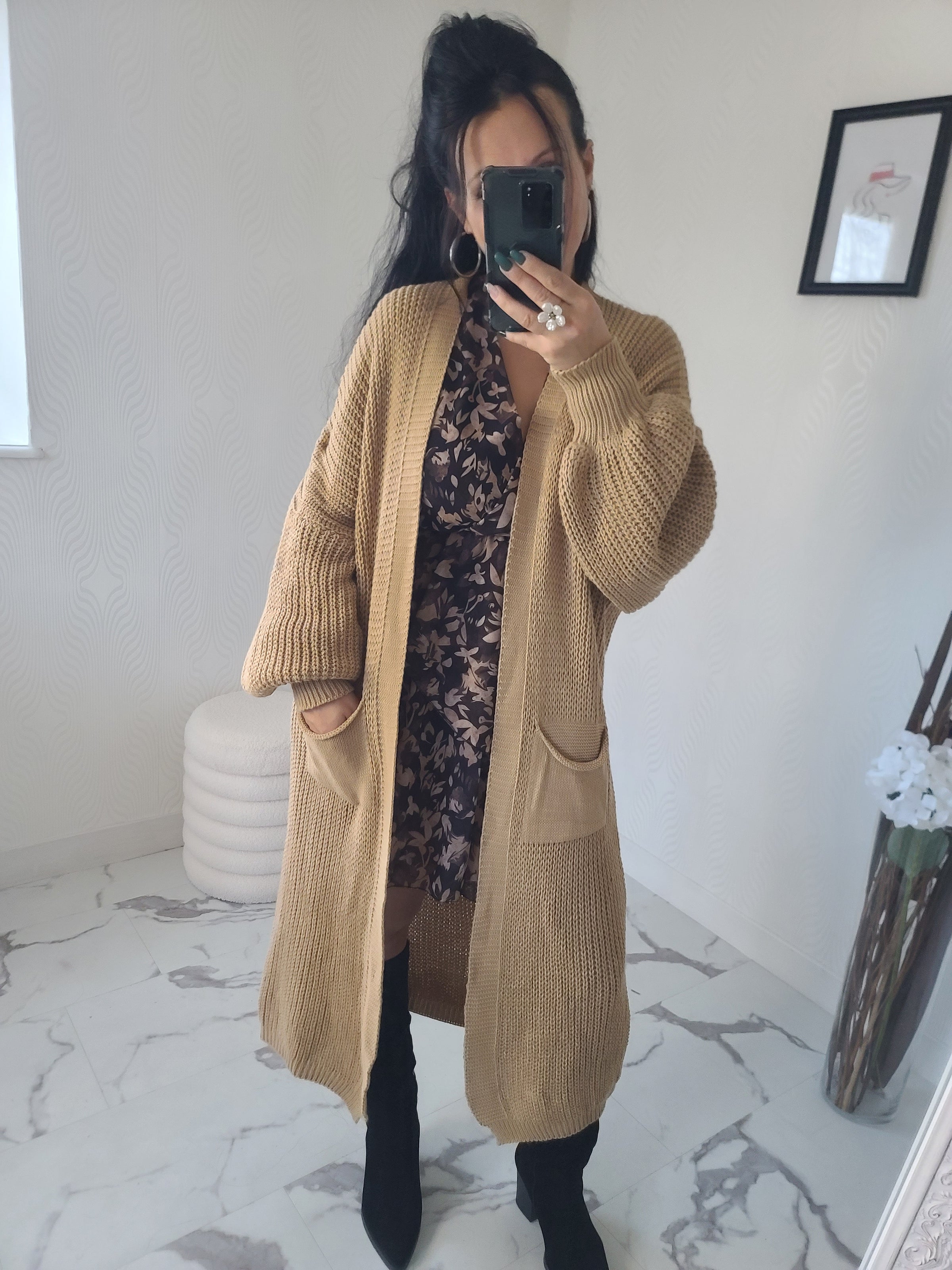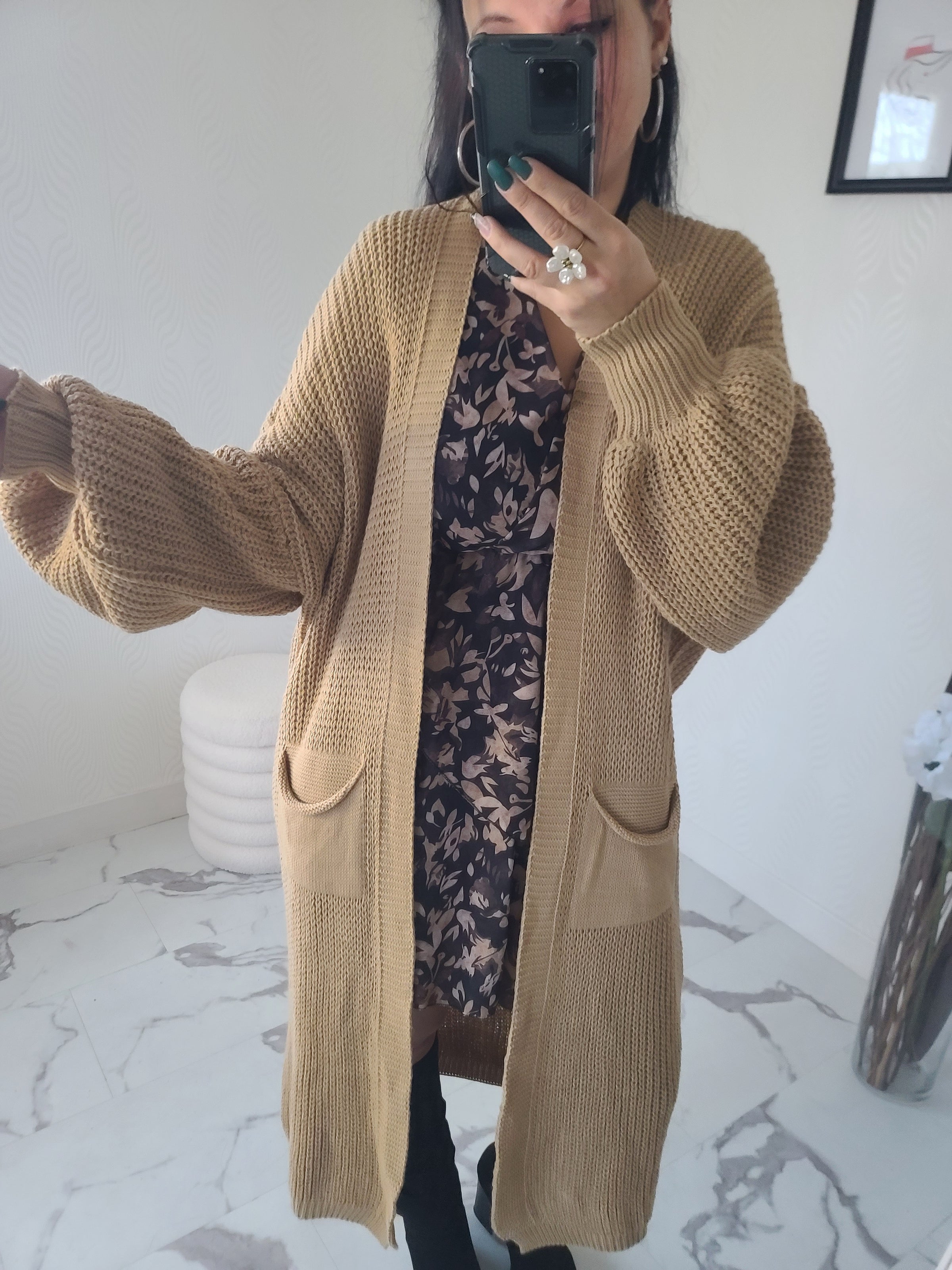 Gilet long en maille avec poches , à manches bouffantes. La taille unique convient du 36 au 44