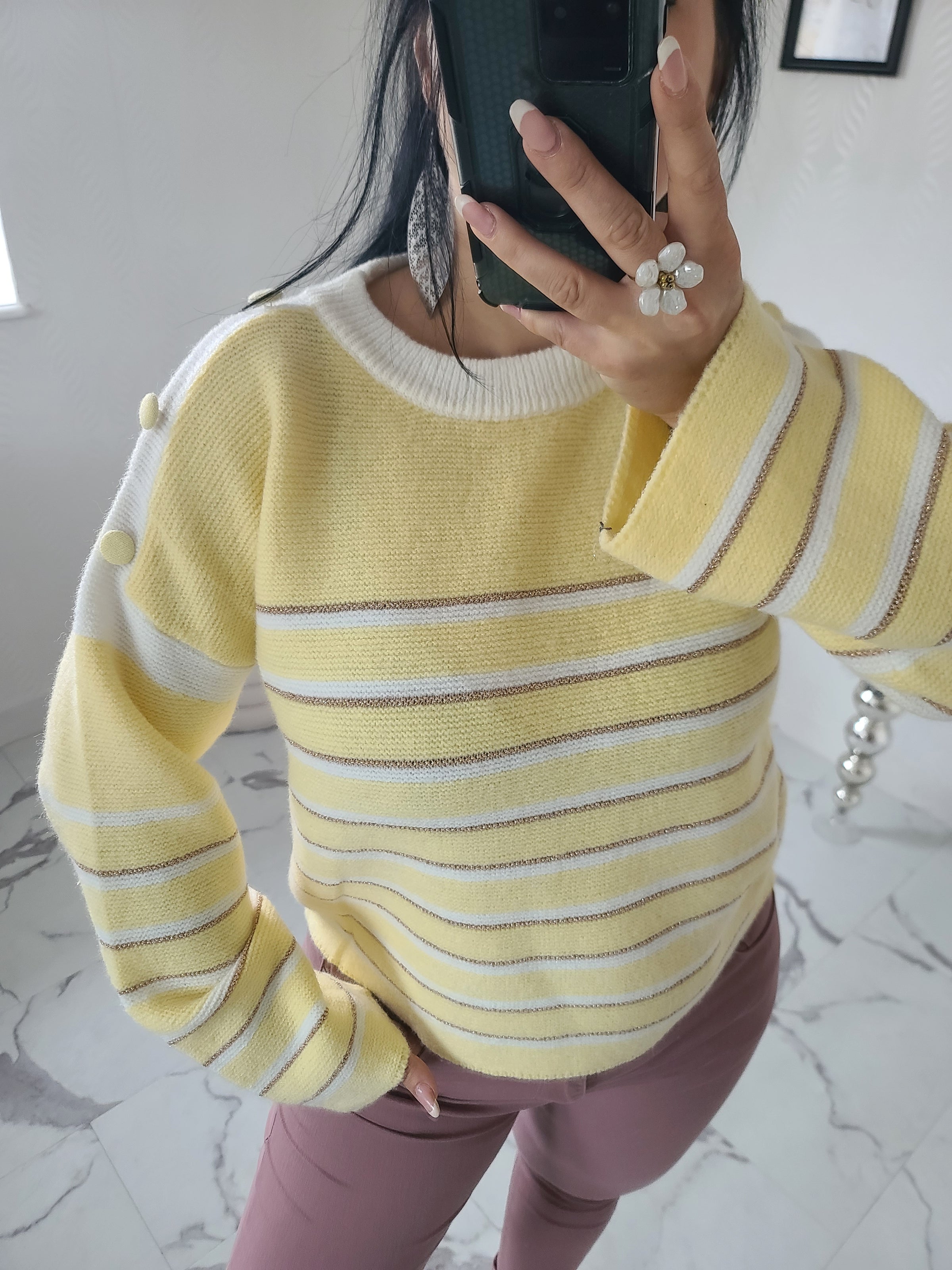 Pull en tricot à rayures, manches longues et col rond. Détails avec boutons sur les épaules pour une touche élégante