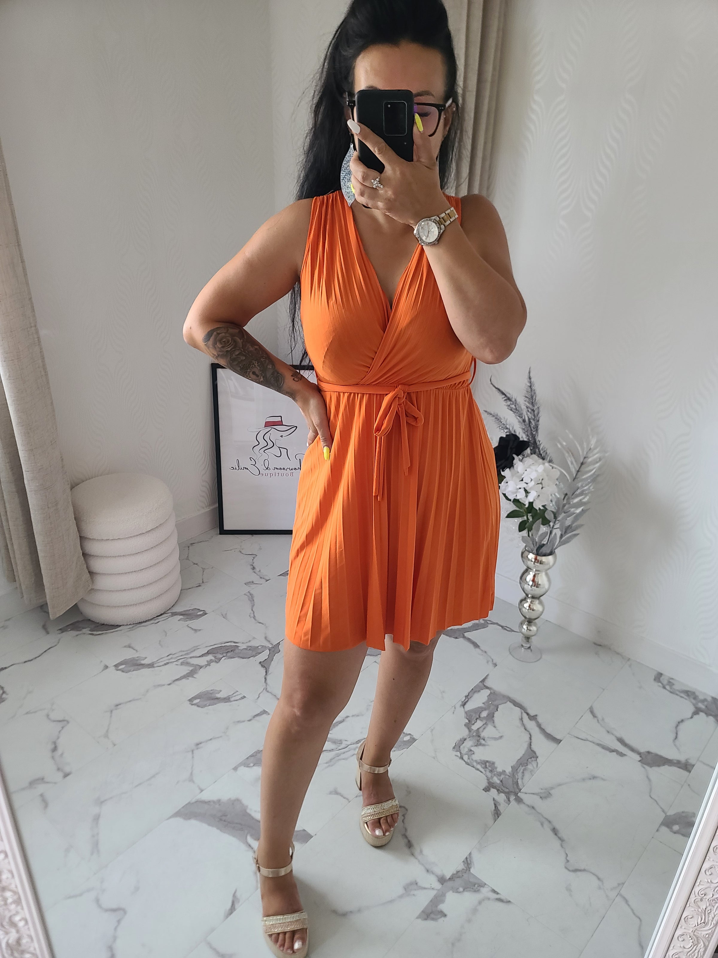 Robe courte uni, plissée, avec ceinture à la taille