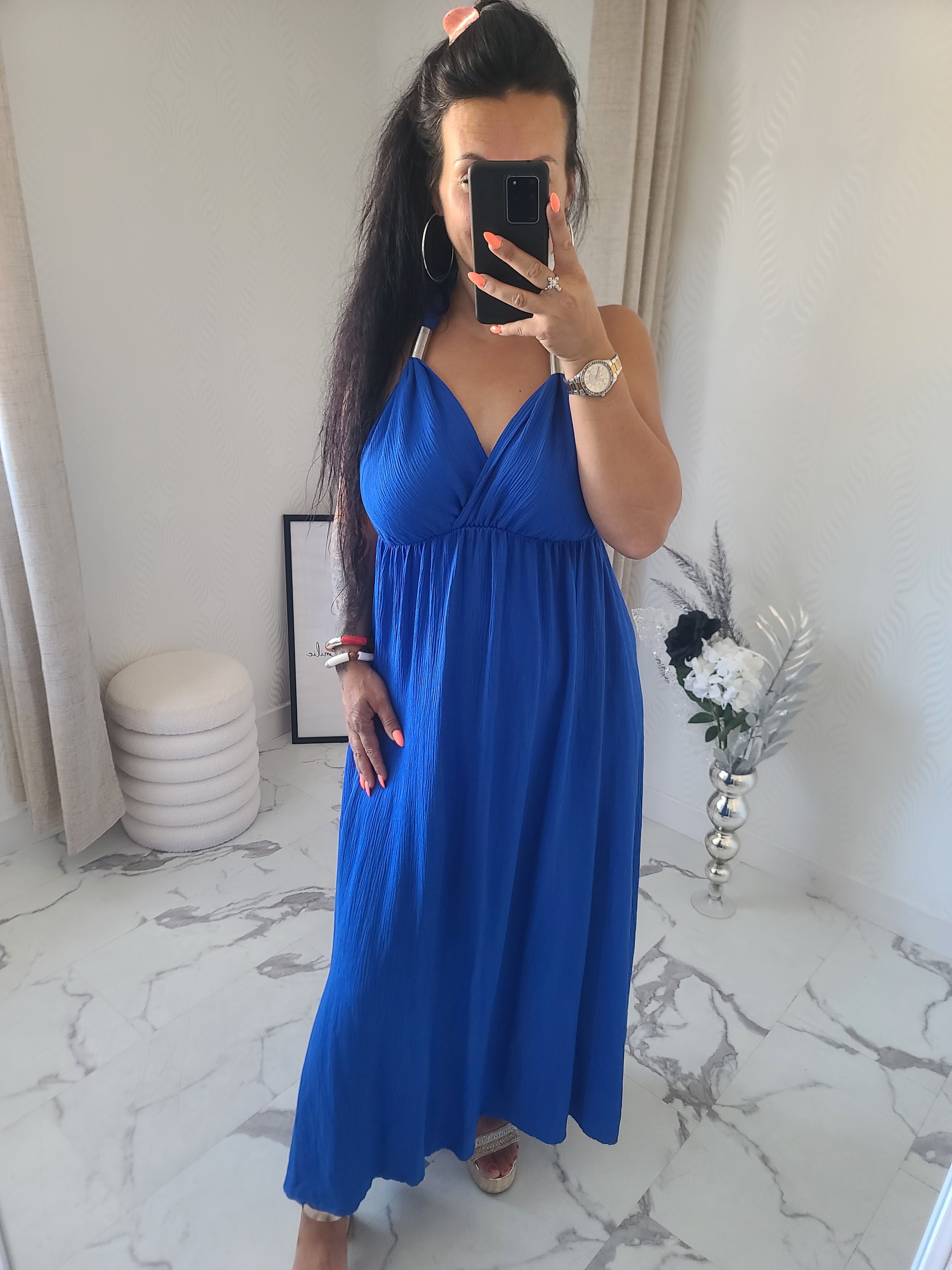 Robe longue unie, dos nu avec détail argenté qui vous permet d'ajuster la largeur des bretelles. Deux petites fentes sur chaque côtés.