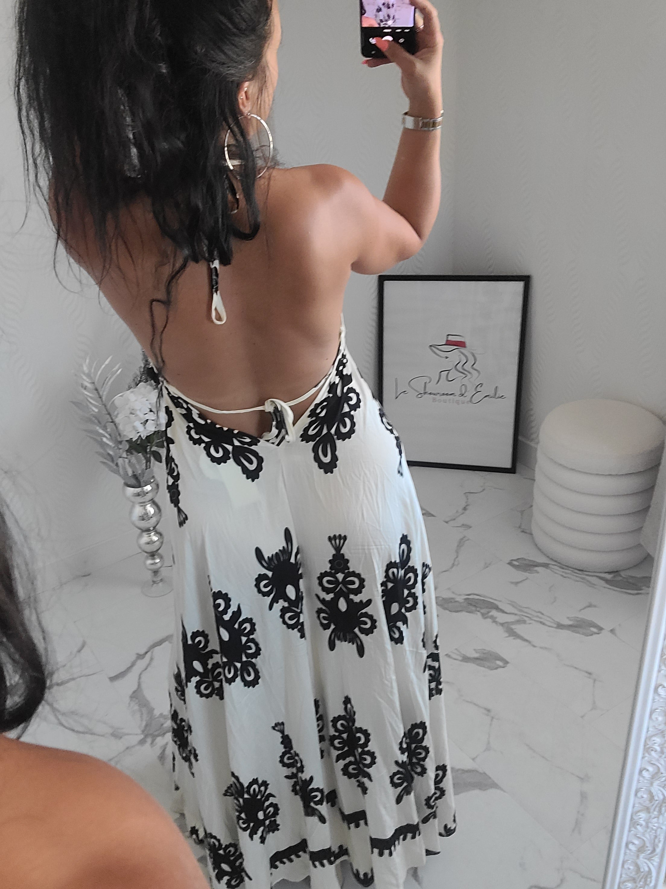 Robe longue imprimée, dos nu avec lien de serrage à l'arrière