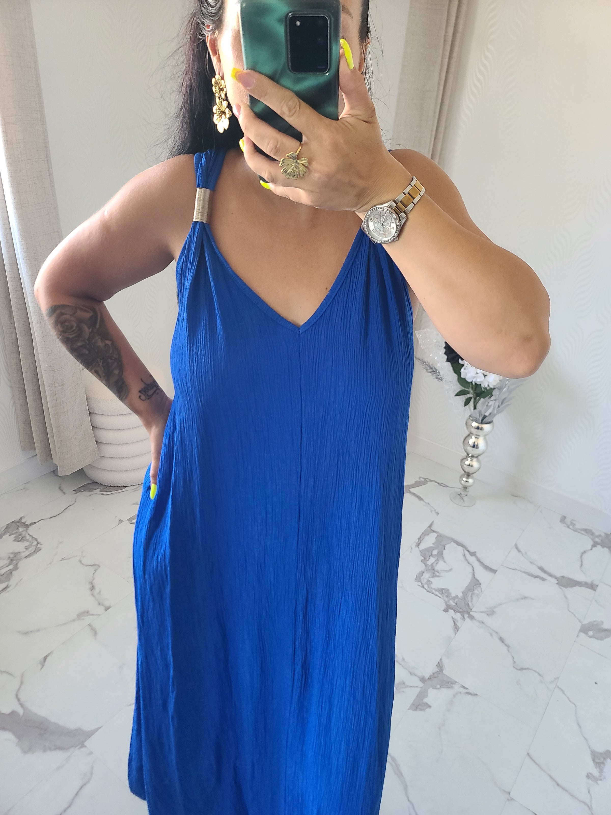 Robe longue uni avec détail argenté qui vous permet d'ajuster la largeur des bretelles