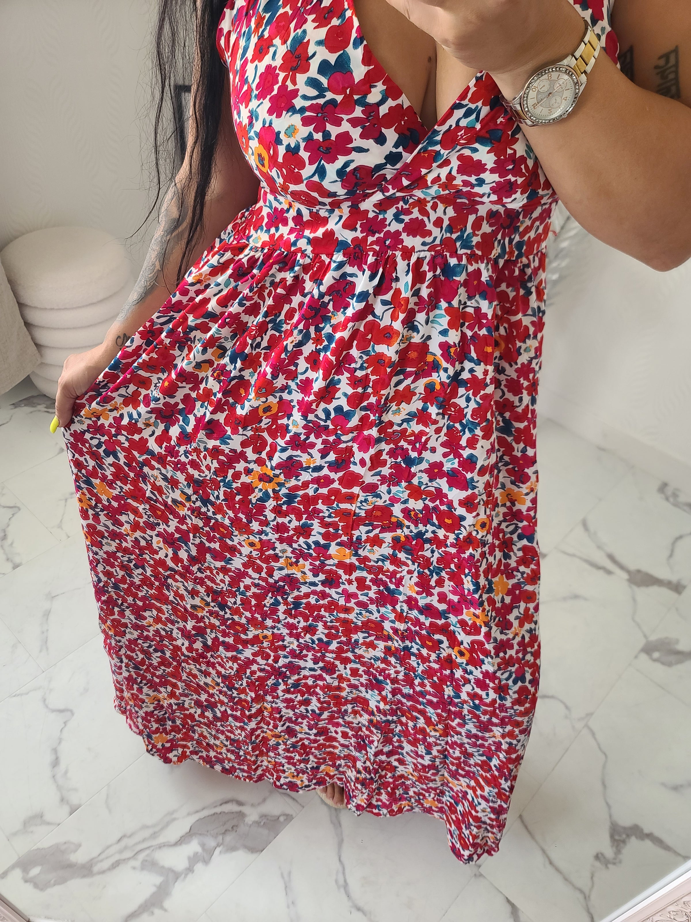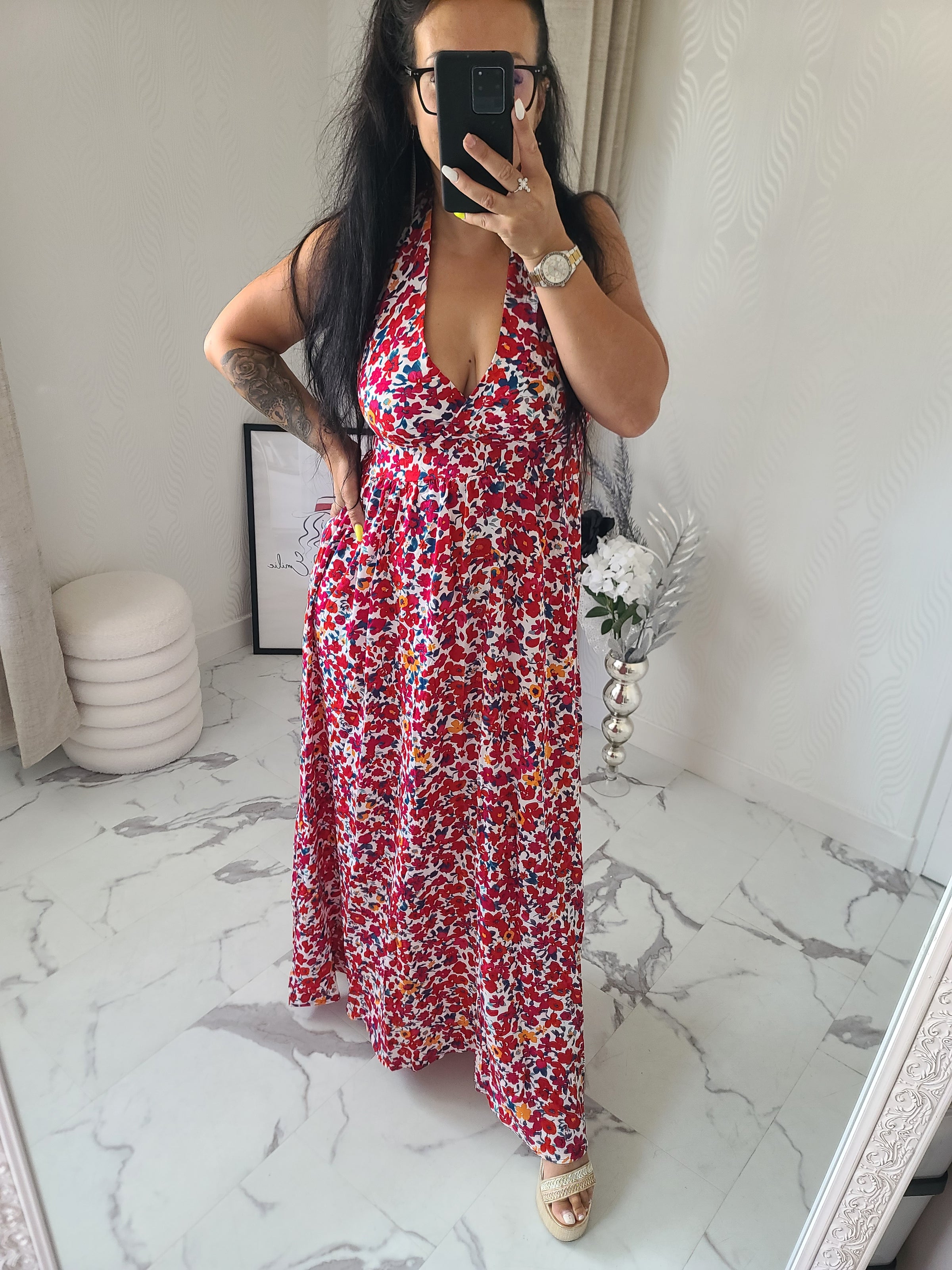 Robe longue fleurie, dos nu