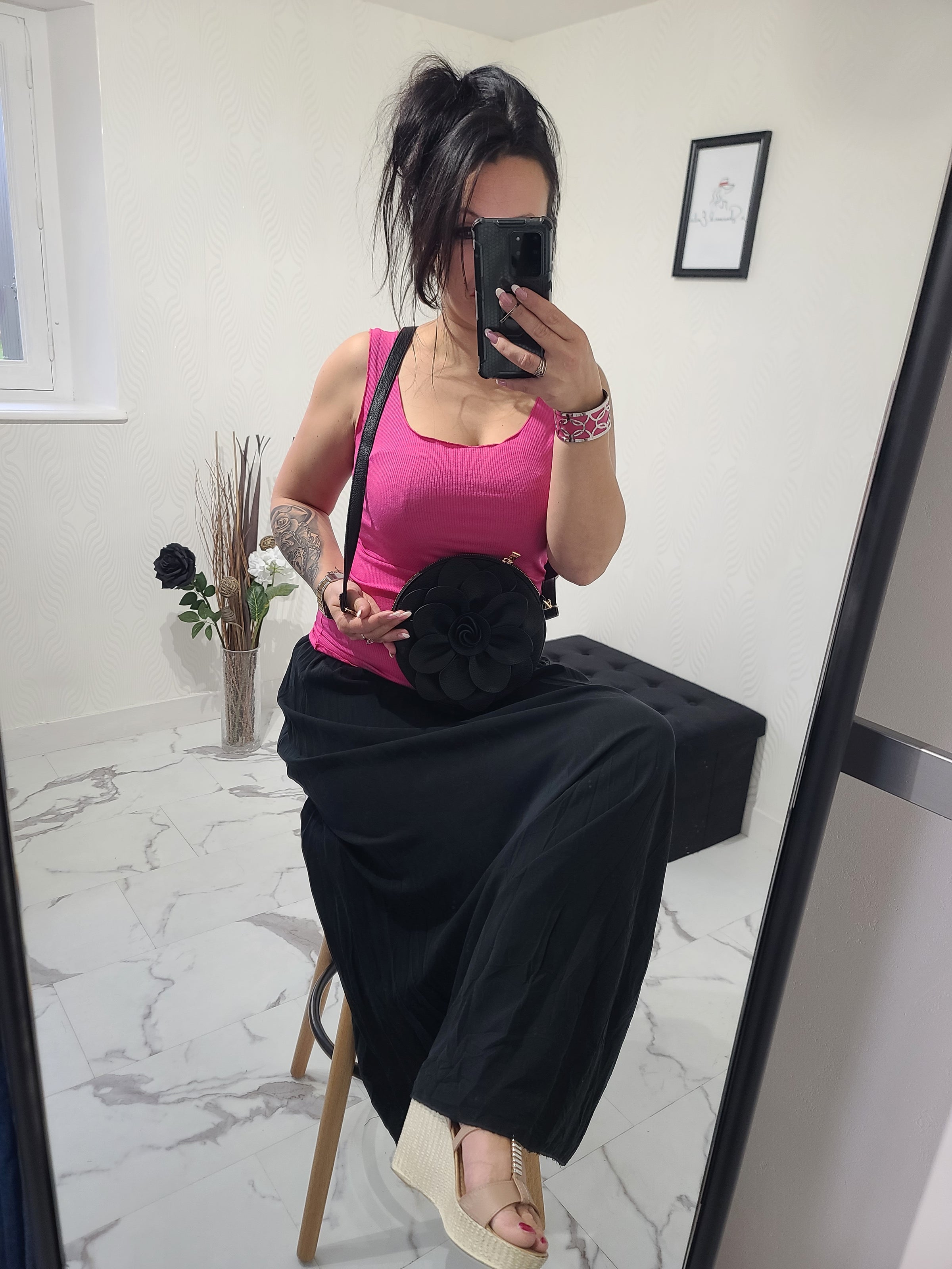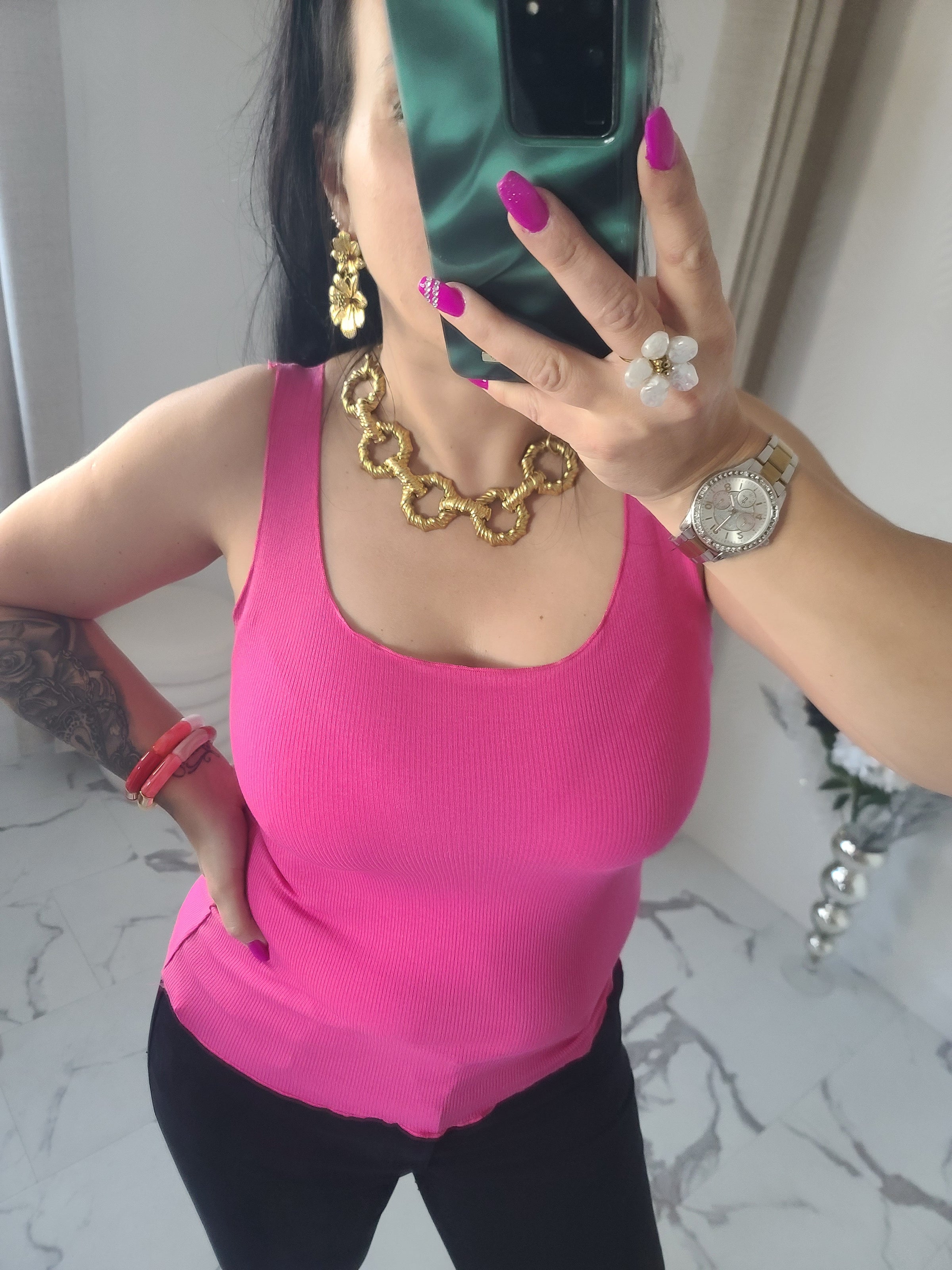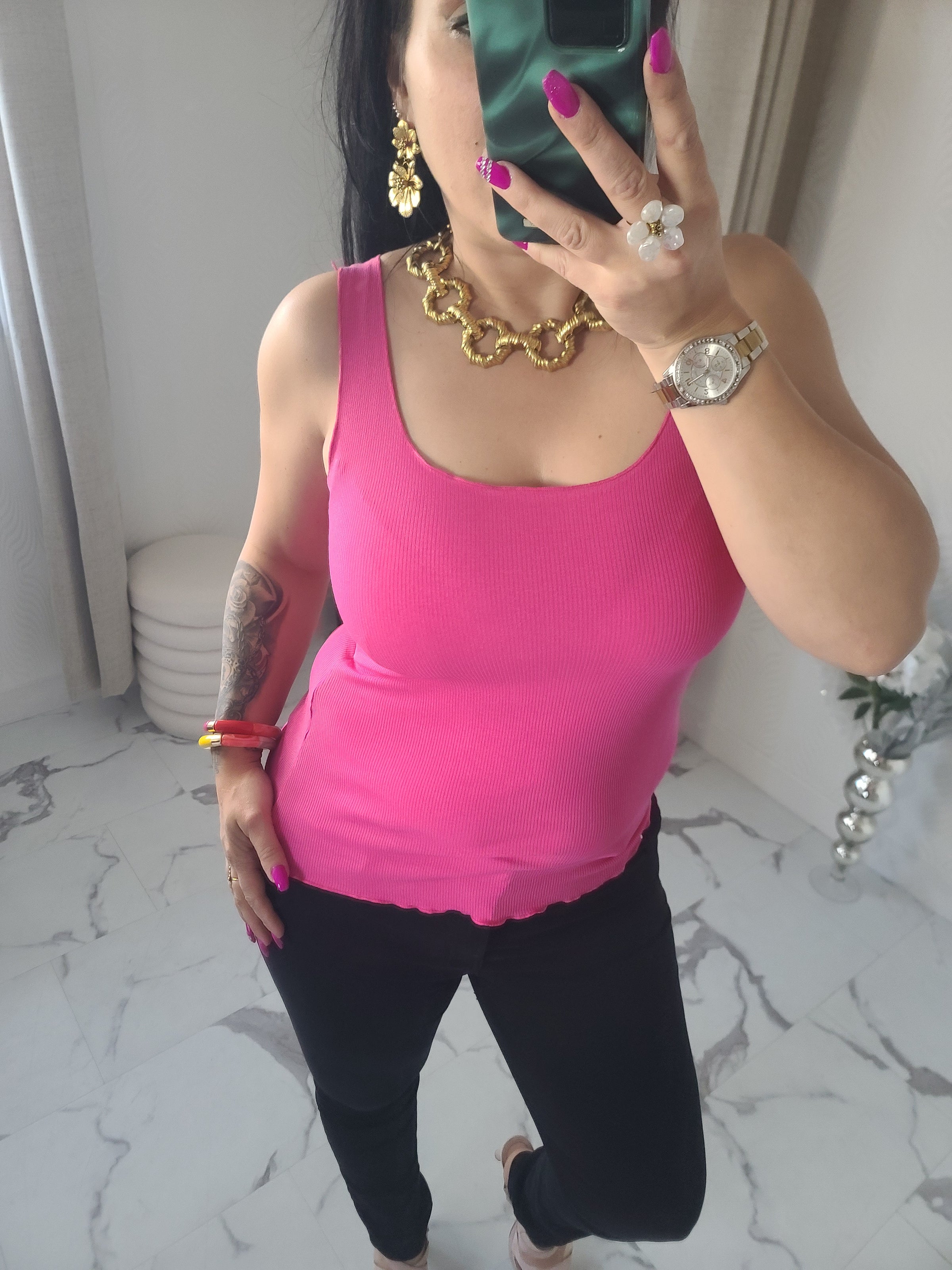 Débardeur Laura basique fuchsia en jersey coton côtelé, détails froncés. Avec sa jolie coupe, il est très doux et agréable à porter, il complétera votre tenue à la perfection! Taille unique qui convient d'un 36 à un 42.